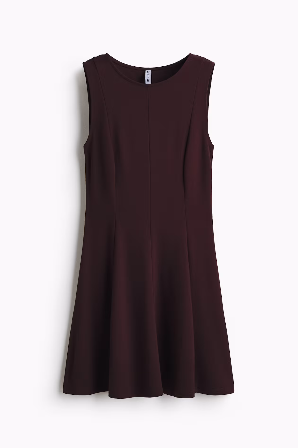 Short, sleeveless dress in ponte jersey with a fitted bodice. Round neckline, vertical shaping seams at front and back, and a flared skirt.