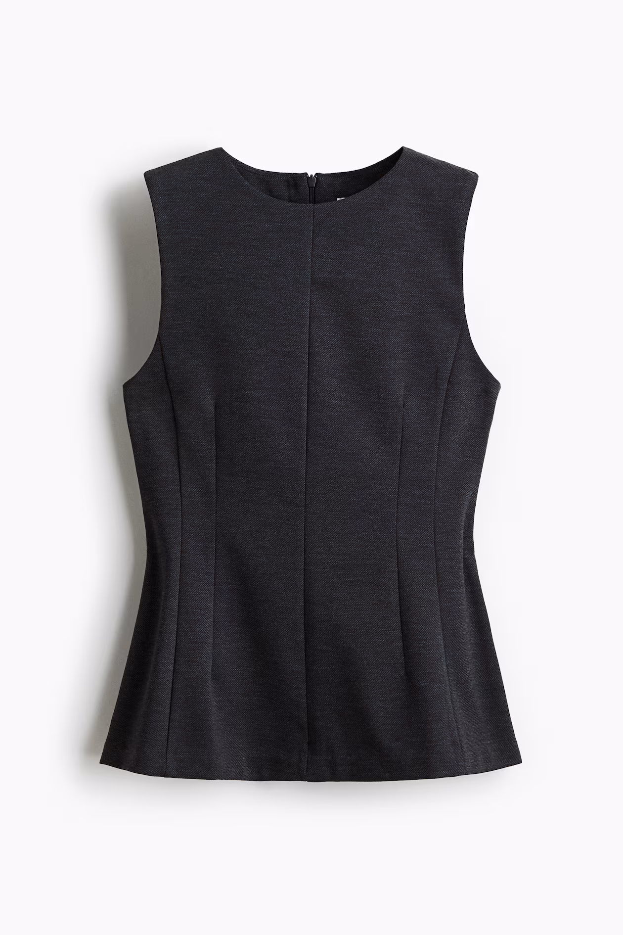 Fitted, sleeveless top in ponte jersey. Concealed zipper at back, vertical shaping seams at front and back, and a peplum.