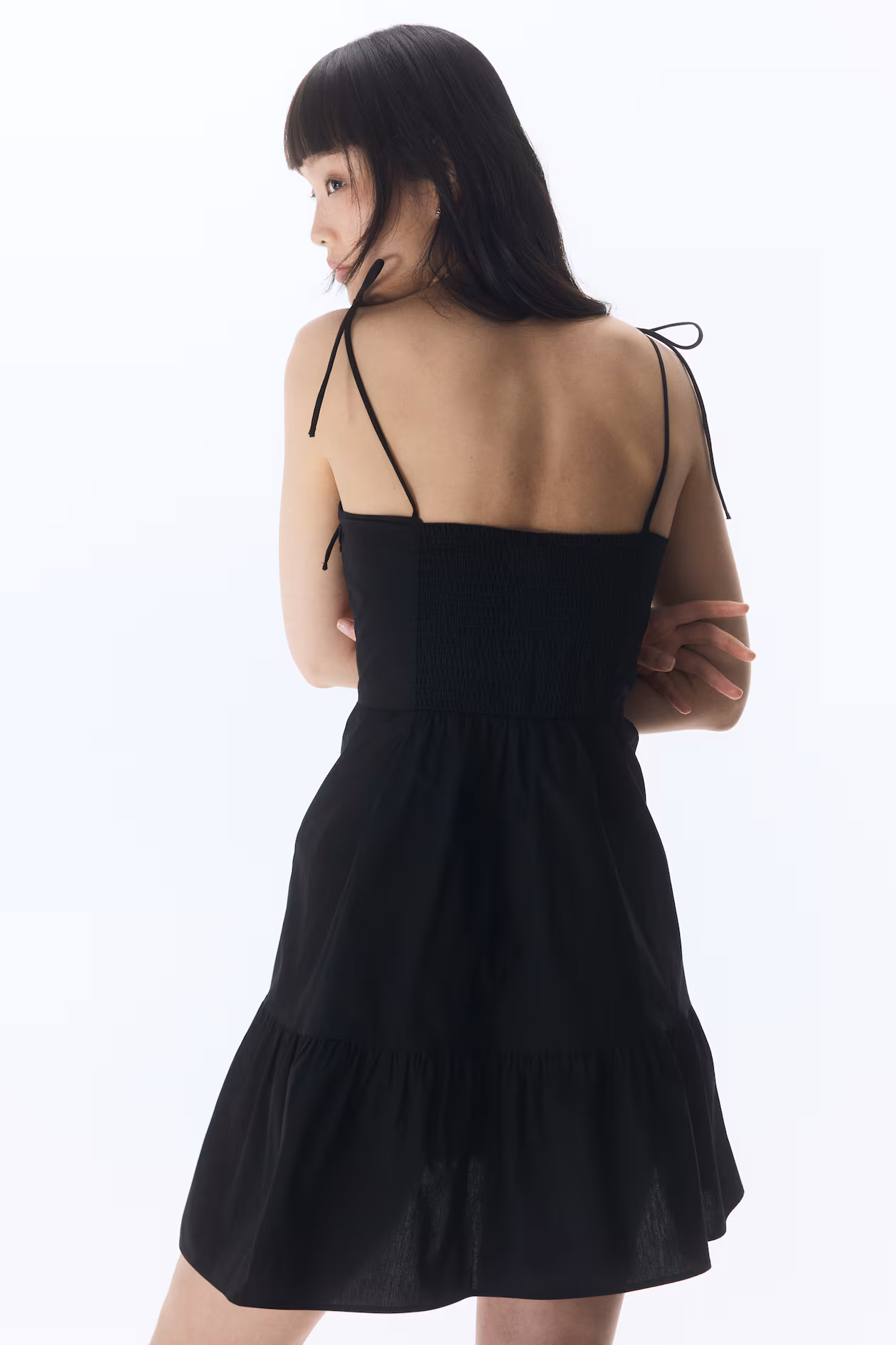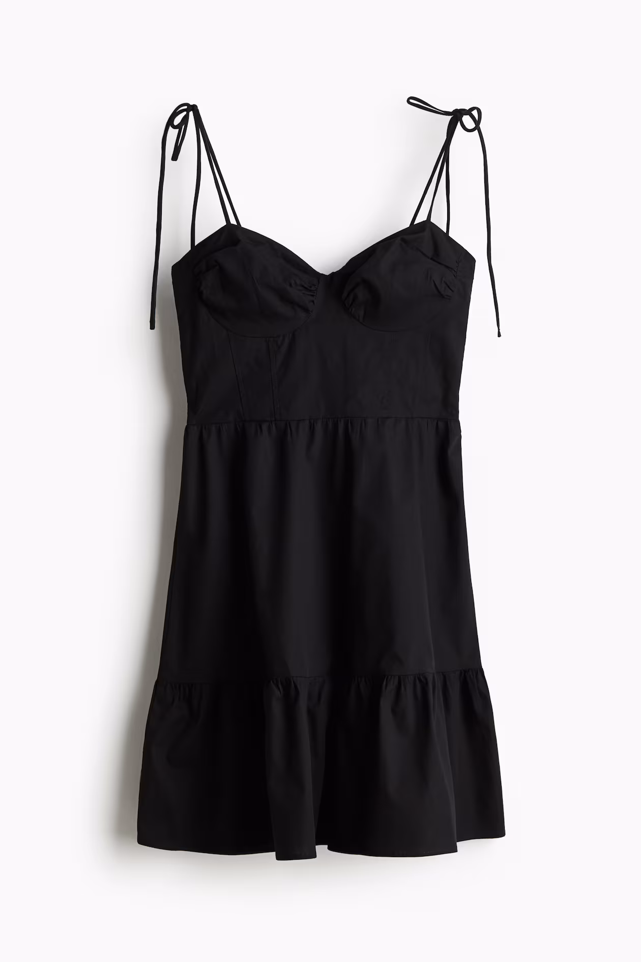 Short dress in crisp cotton poplin. Extra-narrow, tie-top shoulder straps, a sweetheart neckline, and gathered cups. Fitted bodice with visible seams at front and a smocked section at back. Gathered seam at waist and flared skirt with a gathered seam above hem.