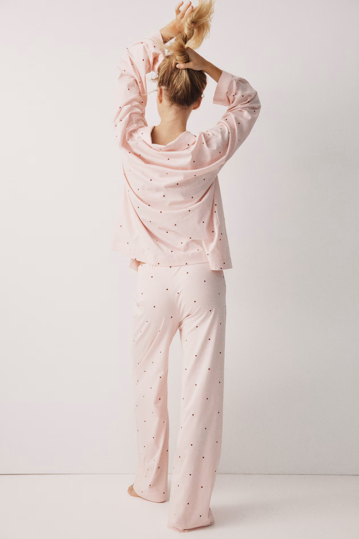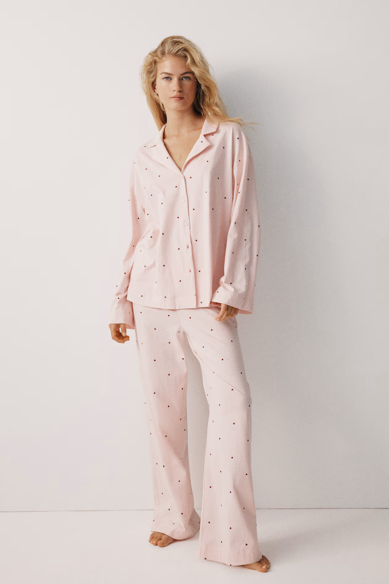 Pajama shirt and pants in cotton jersey with a printed pattern. Shirt with a resort collar, buttons at front, dropped shoulders, and long sleeves. Pants with covered elastic at waistband and straight legs.