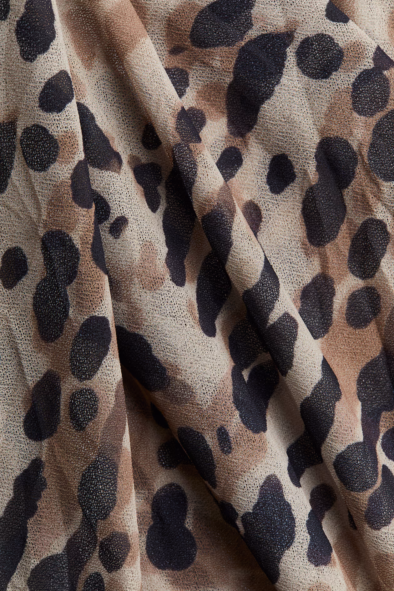 Fitted maxi dress in sheer mesh with a printed pattern. Sweetheart neckline, gathered seam at center bust, and short puff sleeves with narrow elastic at cuffs. High slit at front. Partly lined.
