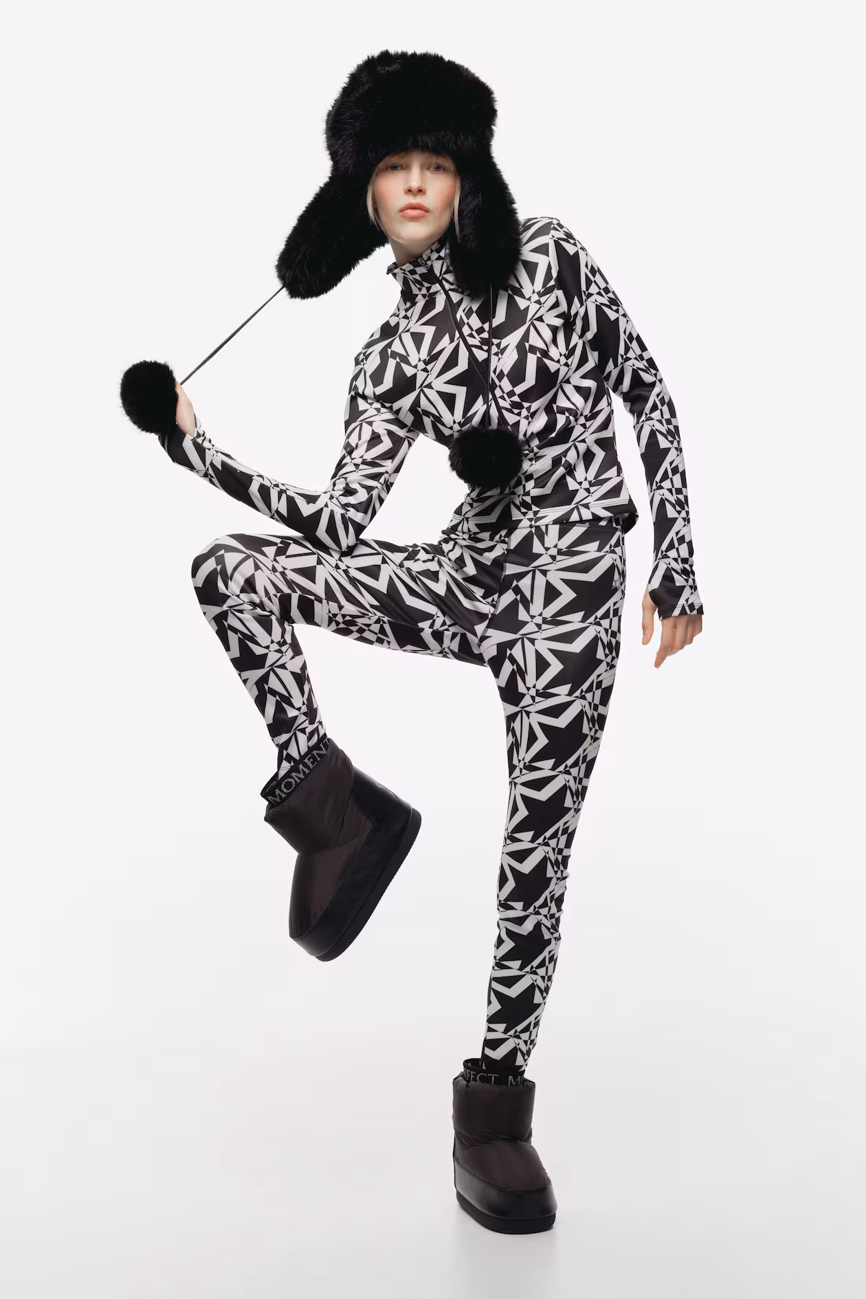 Fitted top in sculpting, scuba-like fabric with a printed pattern. Double-layered mock turtleneck with a small foil-printed detail at one side. Half-zip, extra-long sleeves with thumbhole, and a gently curved hem. The top's pattern, neck detail, and zipper pull all with the brand’s signature star motif.