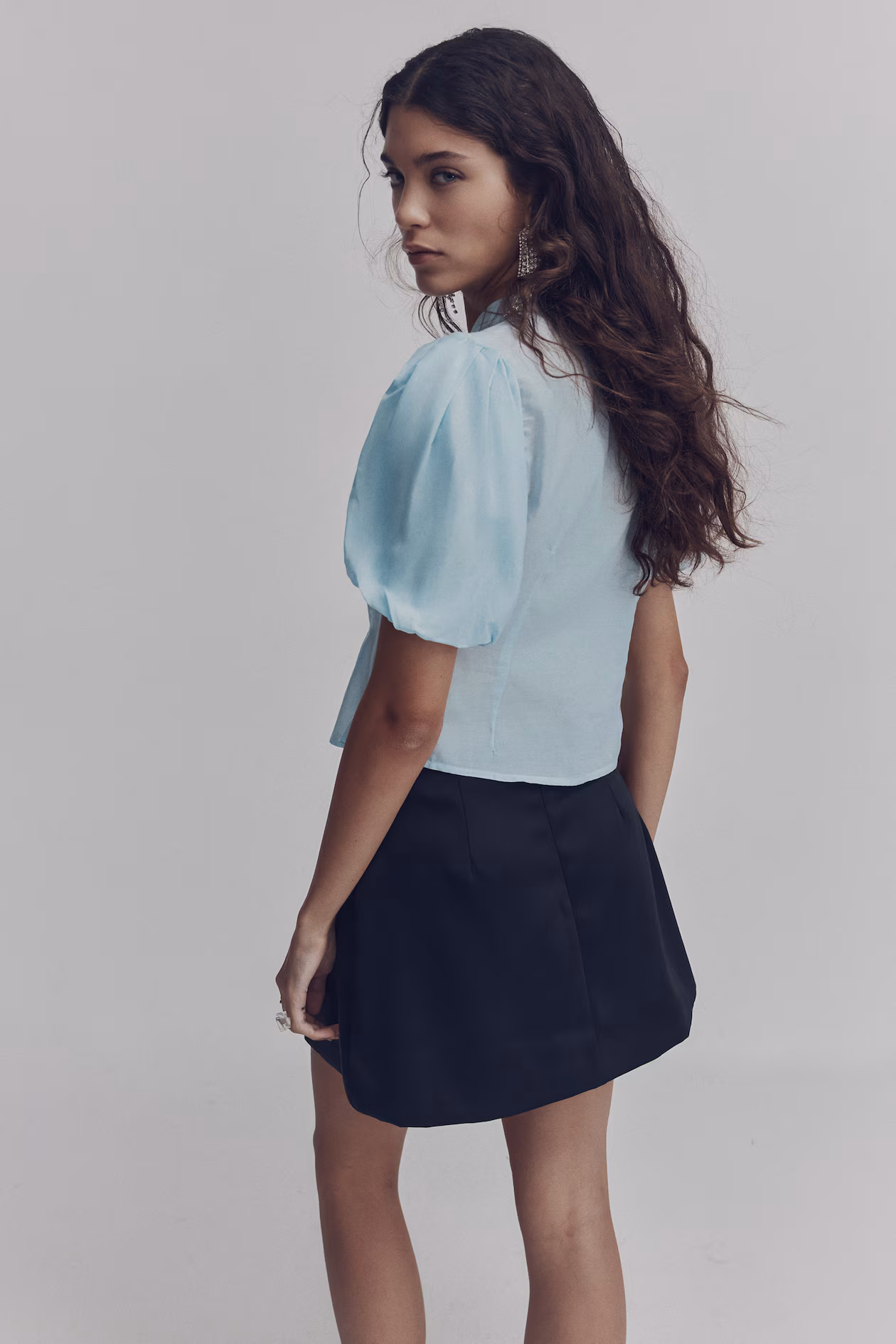 Fitted blouse in a woven cotton and viscose blend. Band collar, V-shaped opening at front with long ties, and short, lined puff sleeves.