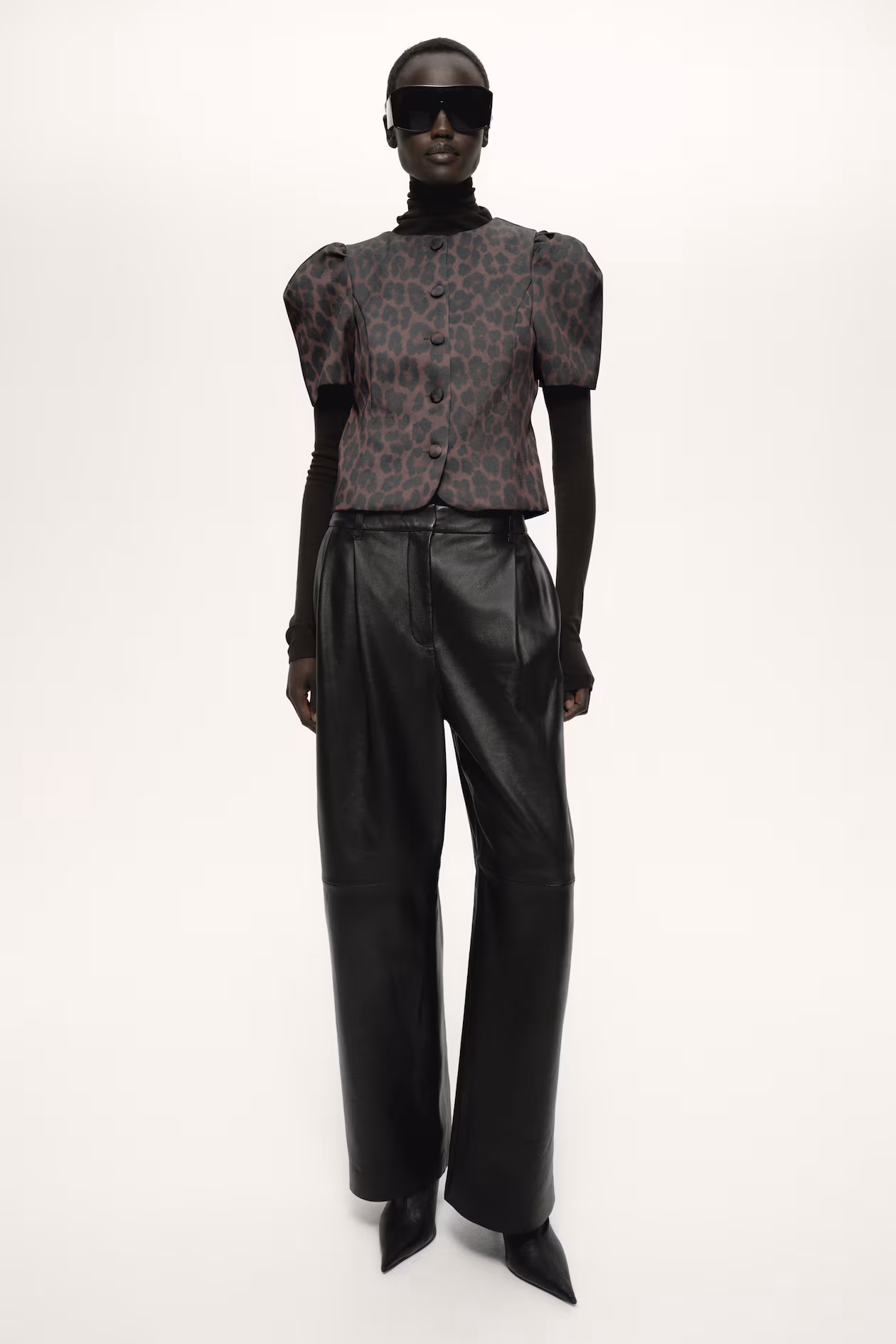 Short, fitted blouse in twill with a slight sheen. Round neckline, covered buttons at front, and short sleeves with pleats at top. Princess seams at front for a flattering silhouette. Partly lined.