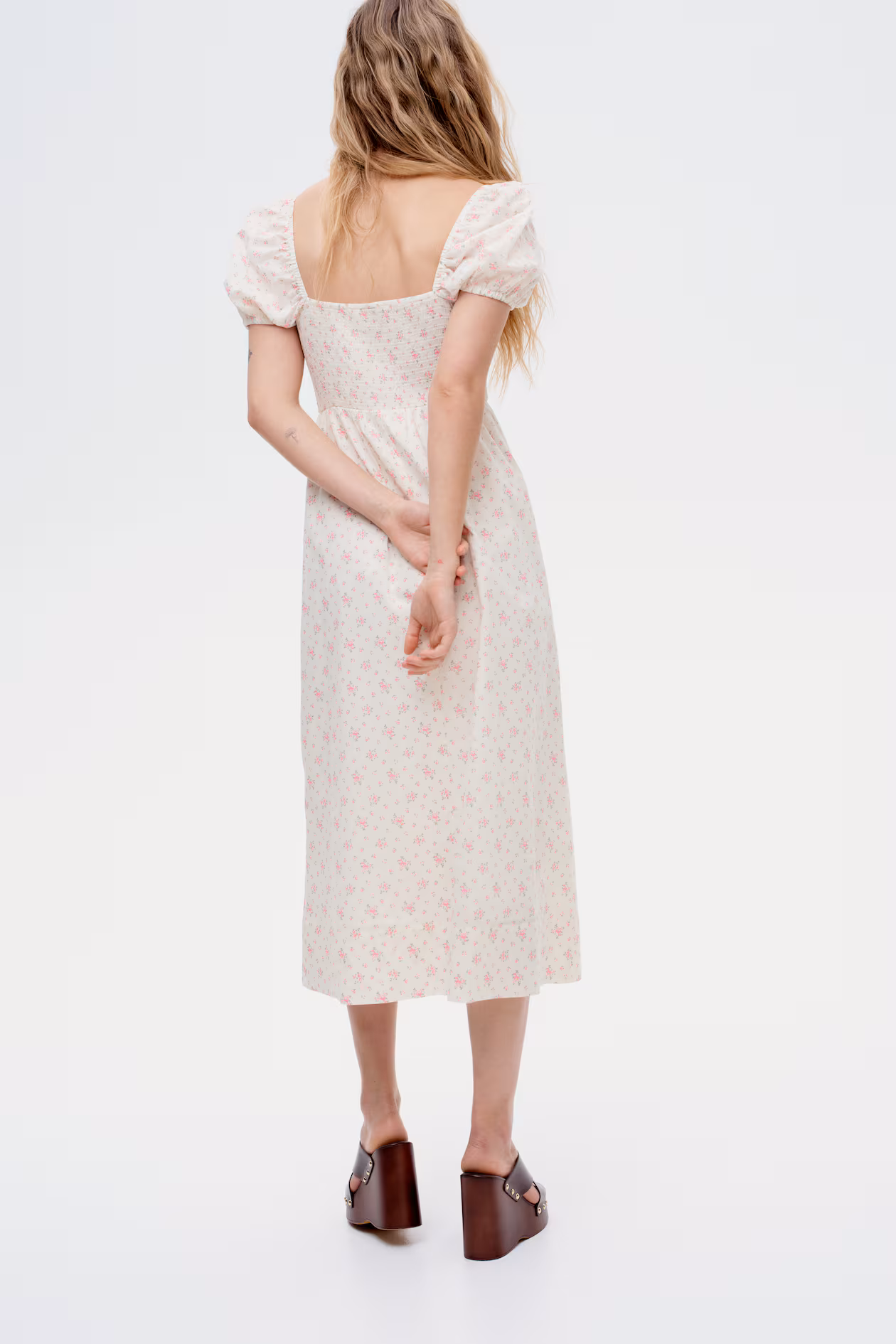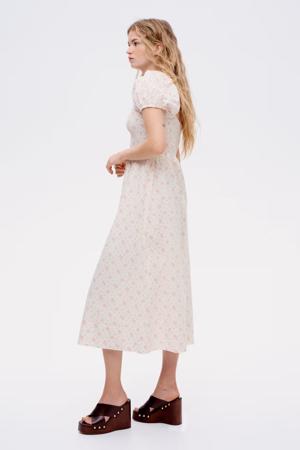 Long dress in airy, woven cotton with a fitted, smocked bodice and gently flared skirt. Square, elasticized neckline, narrow elastic over shoulders, and short puff sleeves with narrow elastic at cuffs. Partly lined.