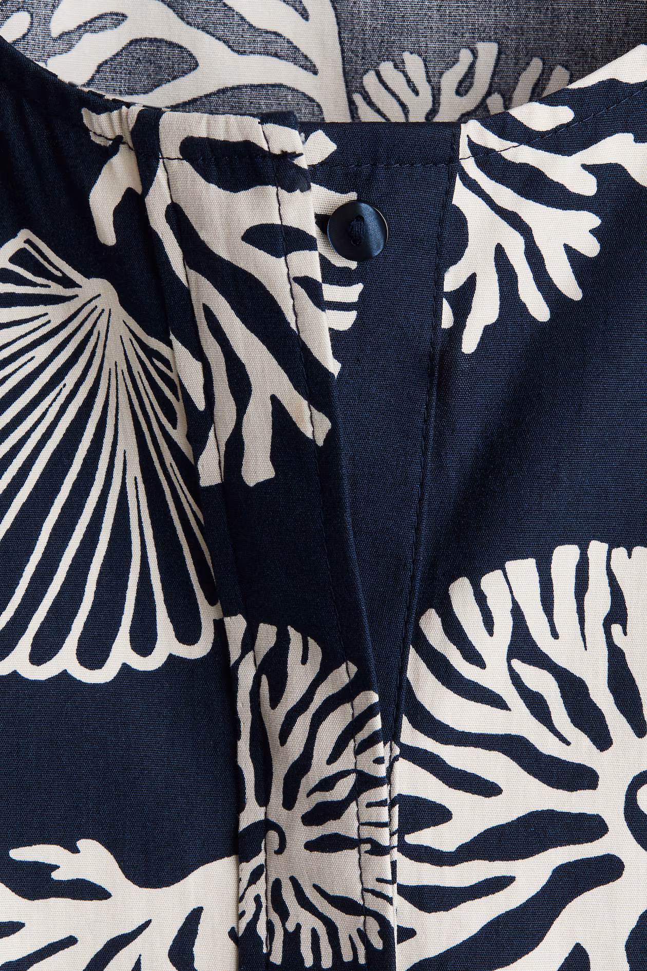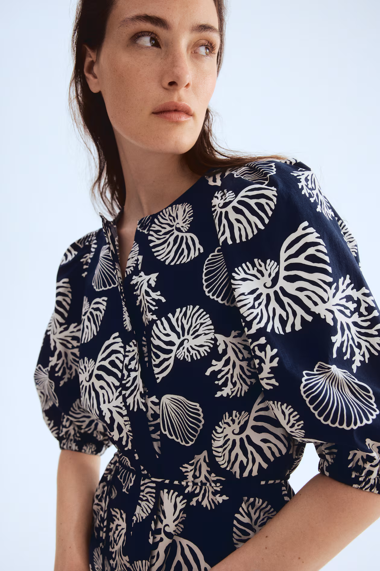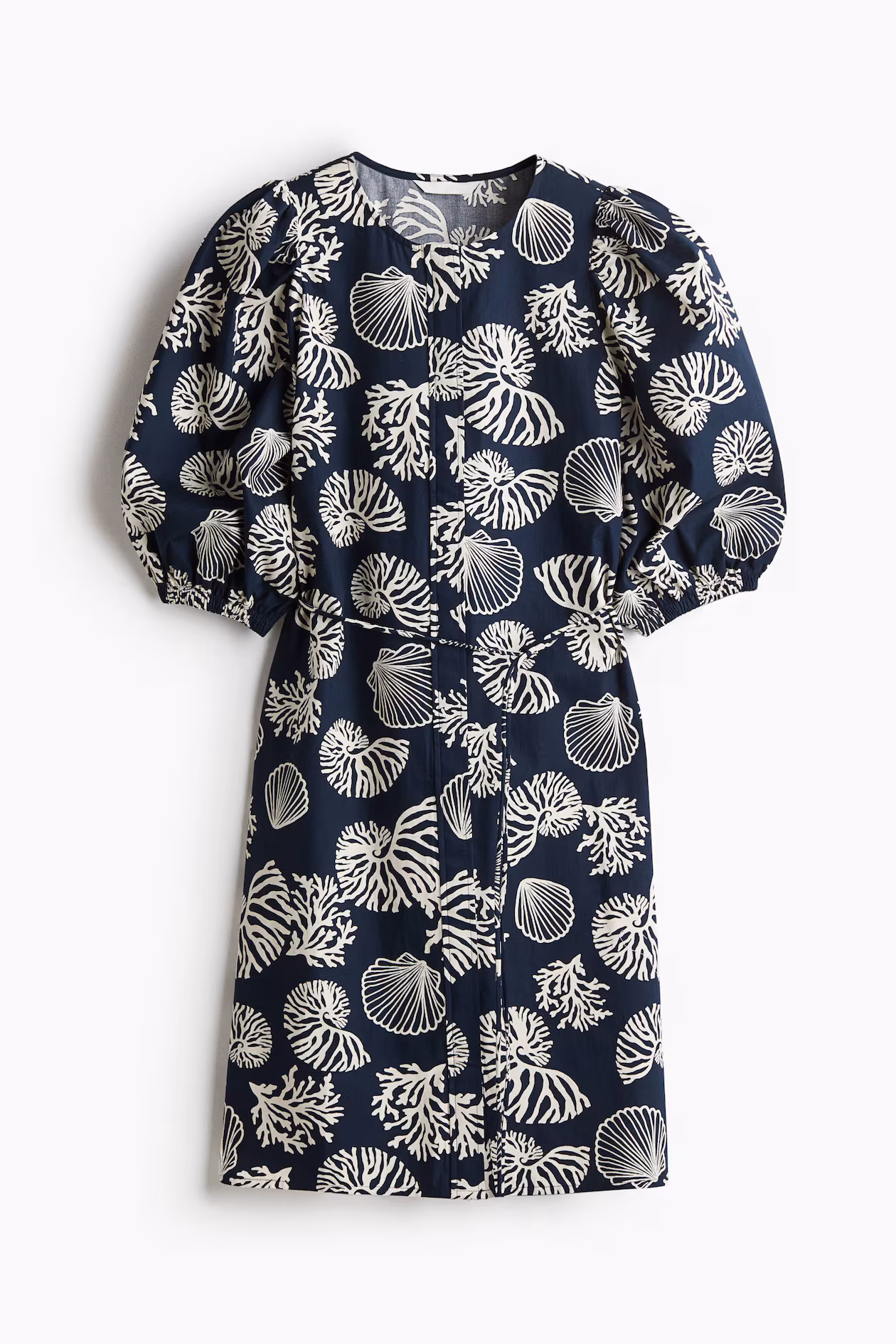 Knee-length dress in woven fabric. Round neckline, buttons at front, and an extra-narrow, removable tie belt at waist. Elbow-length puff sleeves with elasticized cuffs. Unlined.
