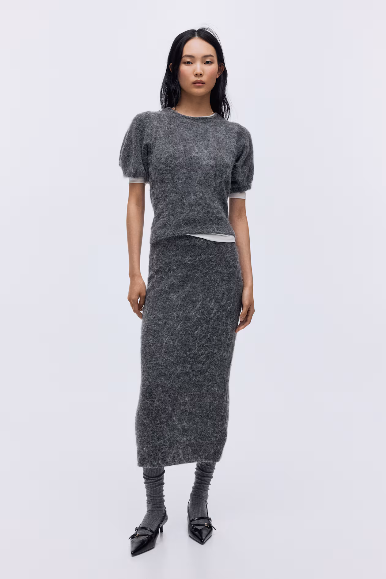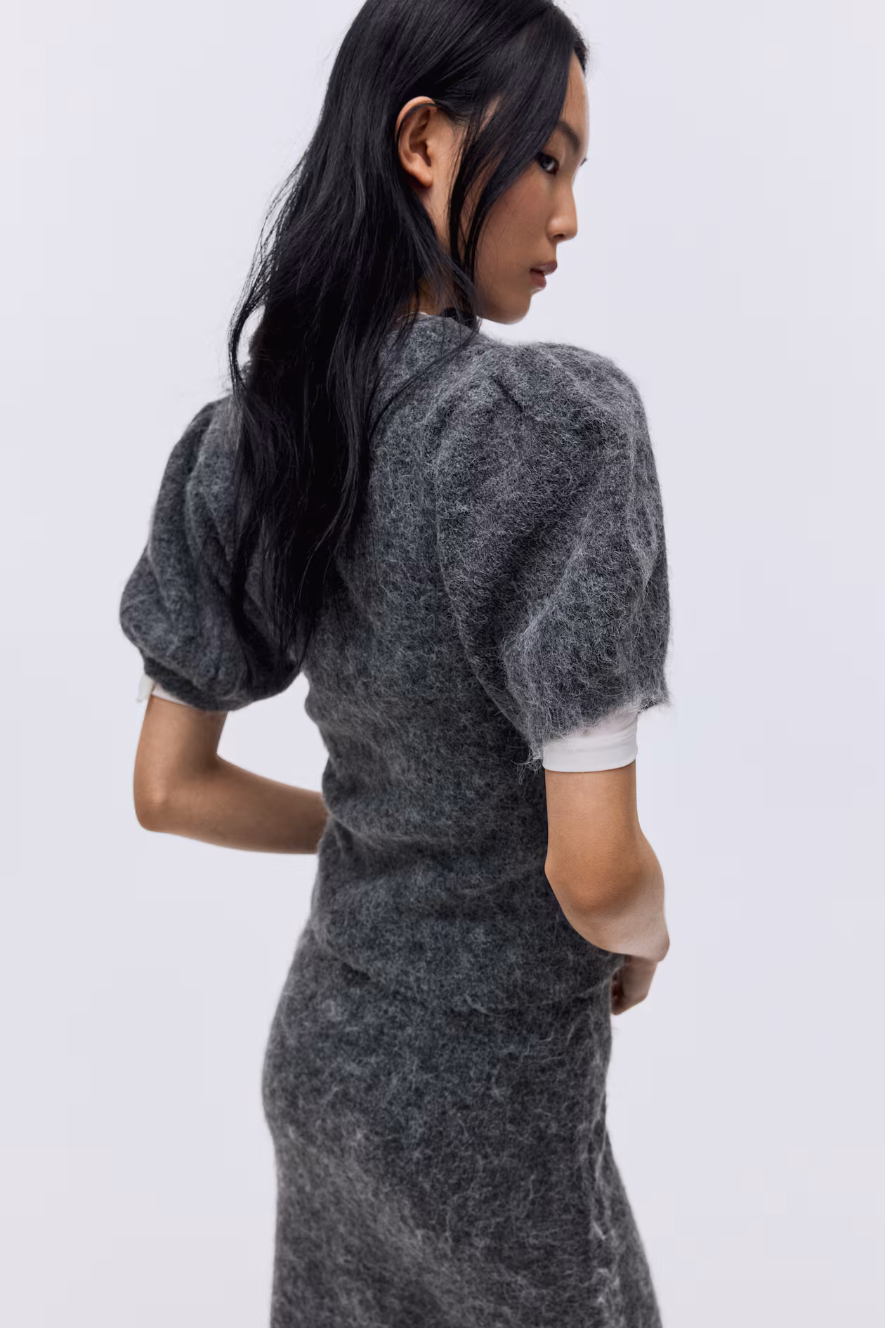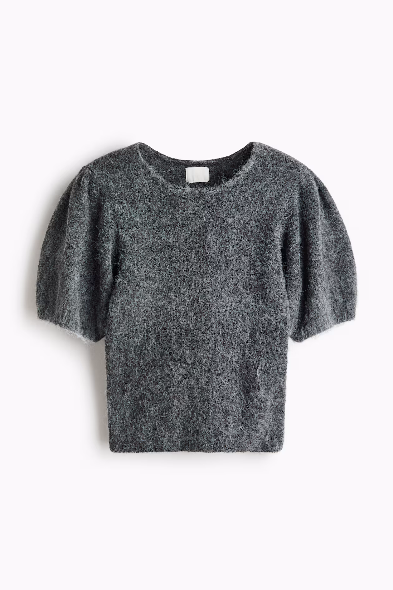 Short, fitted top in a soft, brushed knit. Round neckline and short puff sleeves.