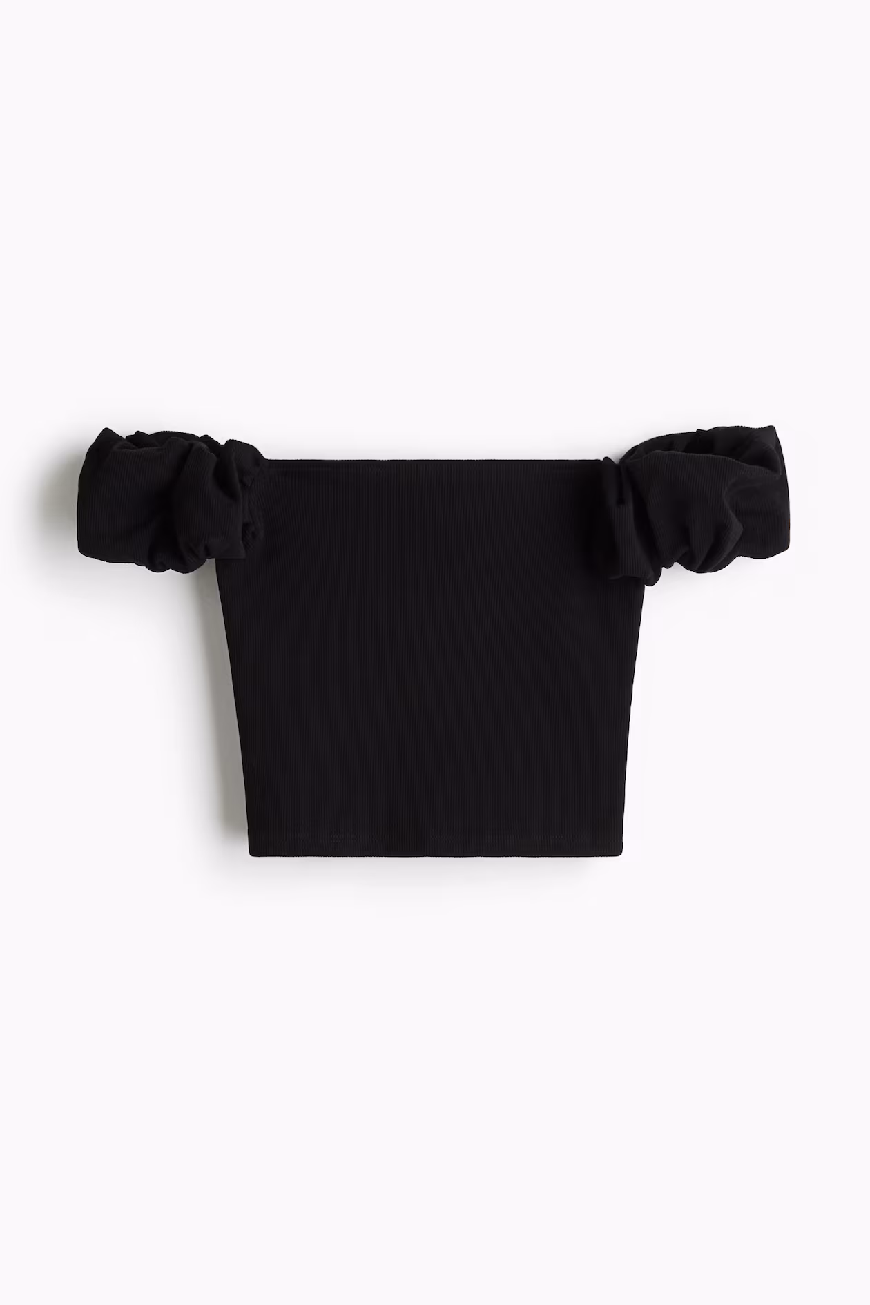 Short, fitted, off-the-shoulder top in ribbed jersey. Short puff sleeves with covered elastic.