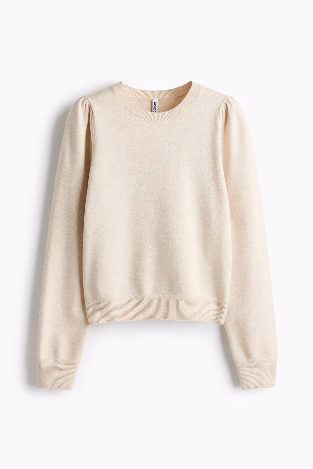 Fitted sweater in a soft knit. Round neck, gathers at shoulders, and long puff sleeves. Ribbing at neck, cuffs, and hem.