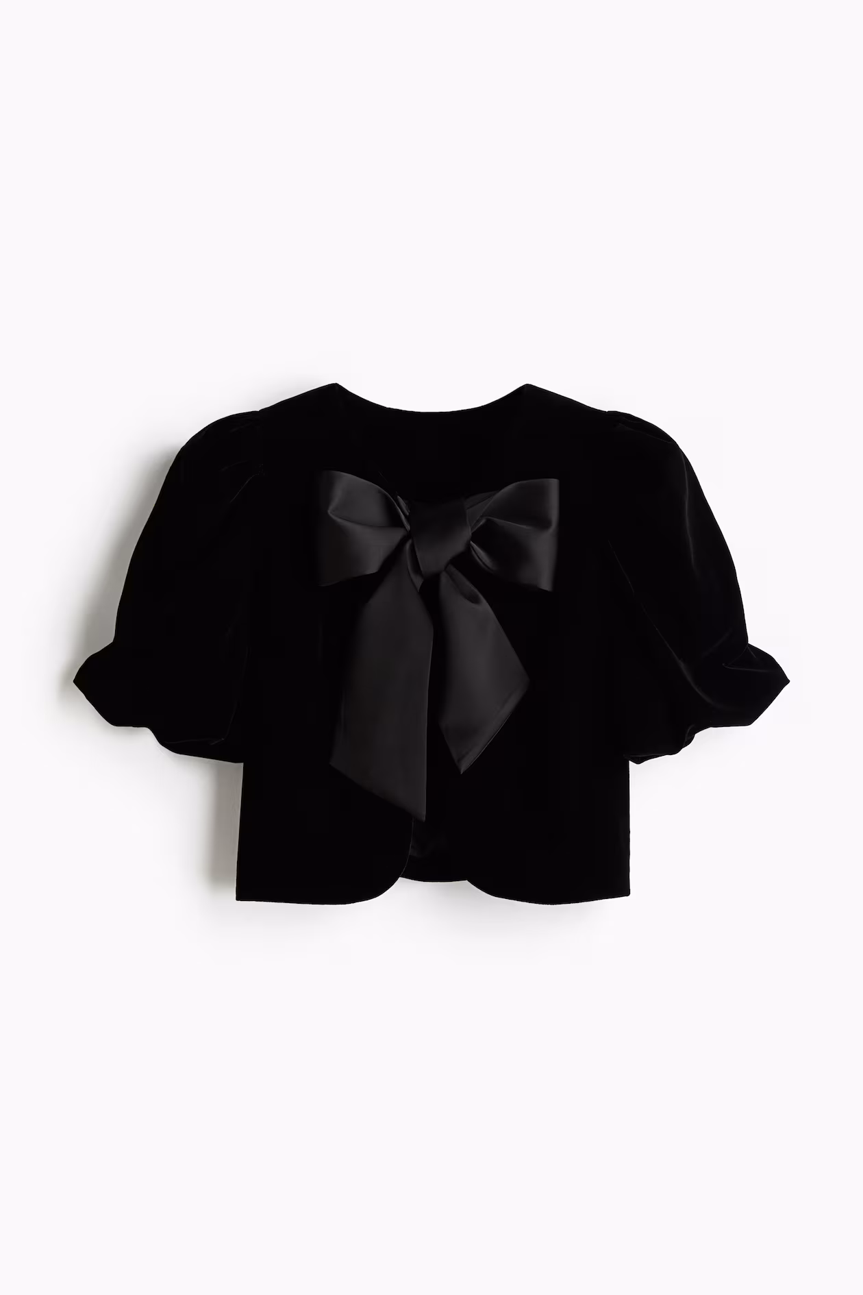 Short top in woven fabric. Round neckline, open front with fastening at top, and short puff sleeves with elasticized cuffs. Lined.