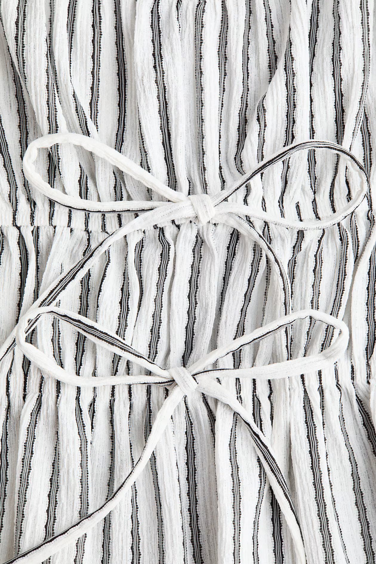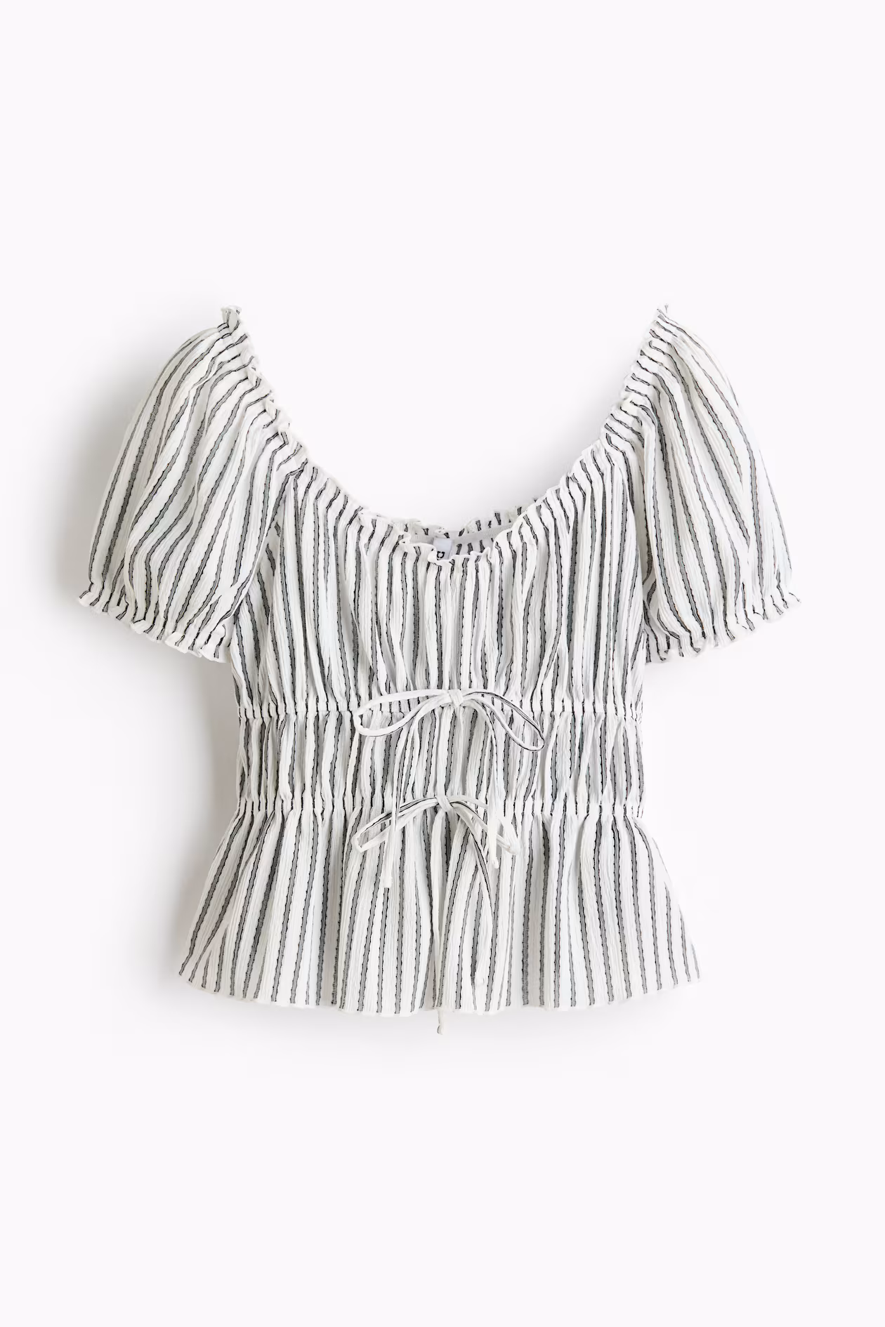 Top in textured jersey. Gently shaped low-cut V-neck with gathered ruffle trim. Short puff sleeves with ruffle-trimmed cuffs. Two elasticized seams at waist with narrow ties, and a gently flared hem.