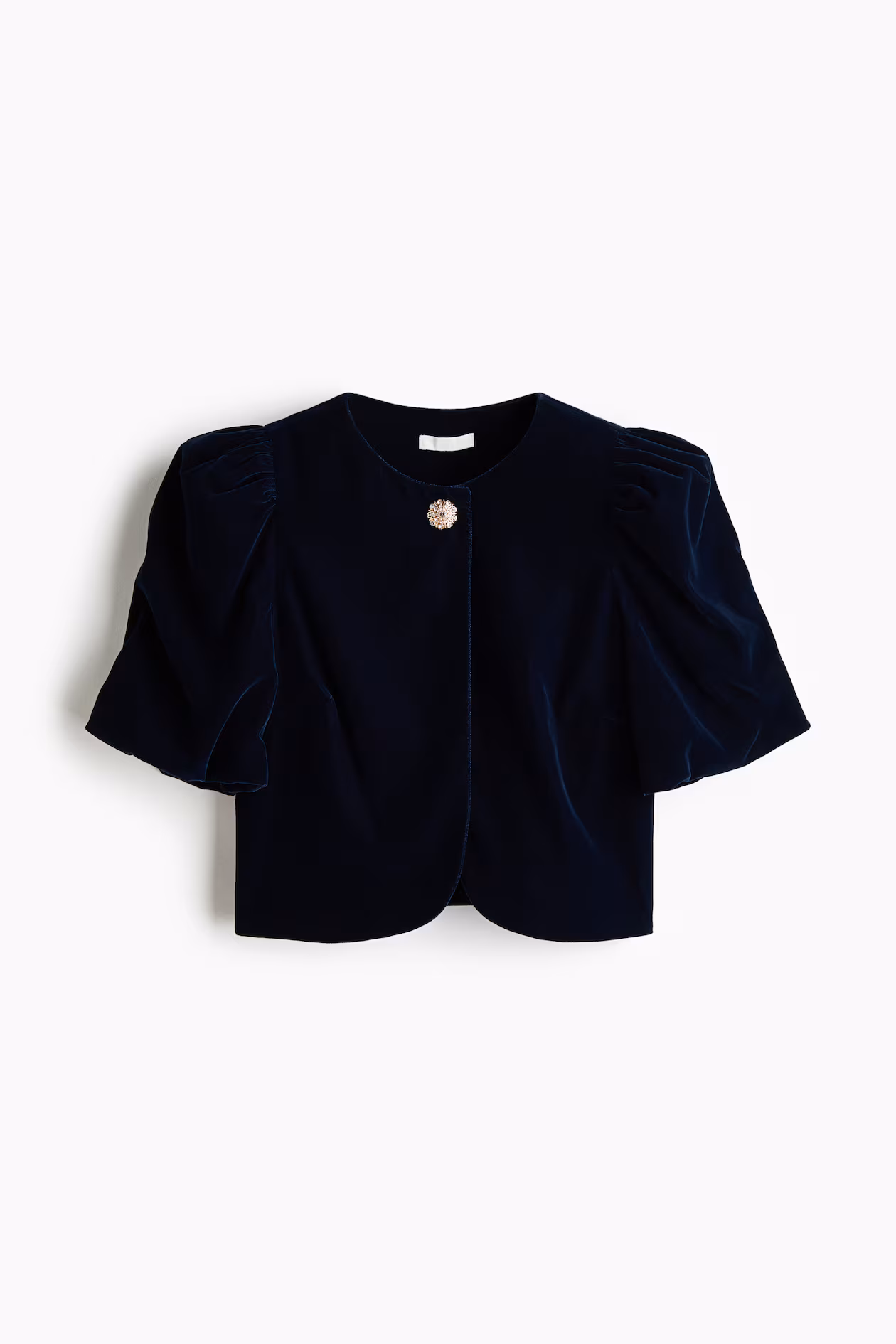 Short top in woven fabric. Round neckline, open front with fastening at top, and short puff sleeves with elasticized cuffs. Lined.