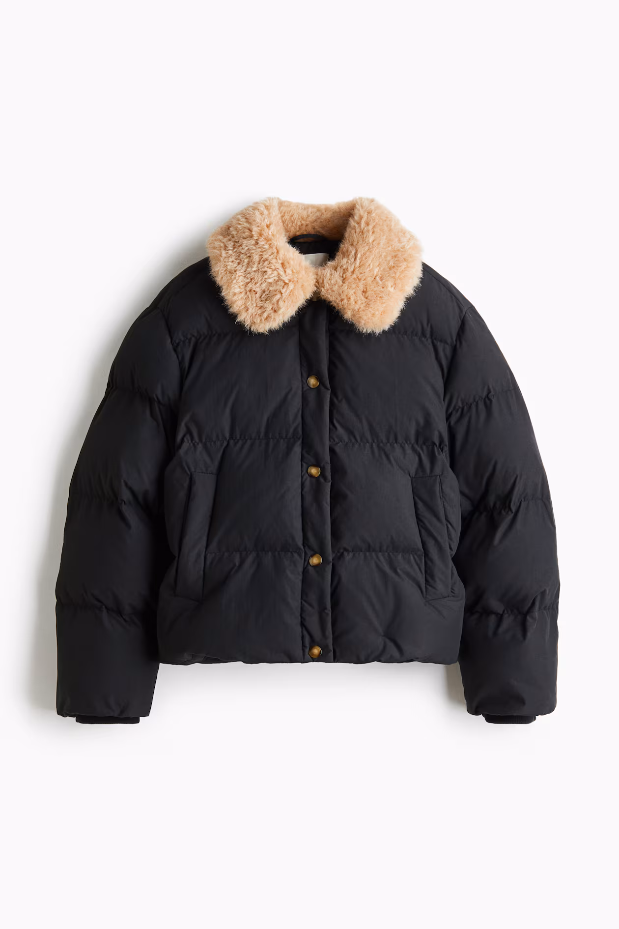 Padded jacket in woven fabric with quilt seams. Collar in soft, fluffy fabric, snap fasteners at front, welt side pockets, and ribbed inner cuffs. Elasticized drawstring at hem with cord stoppers. Lined.