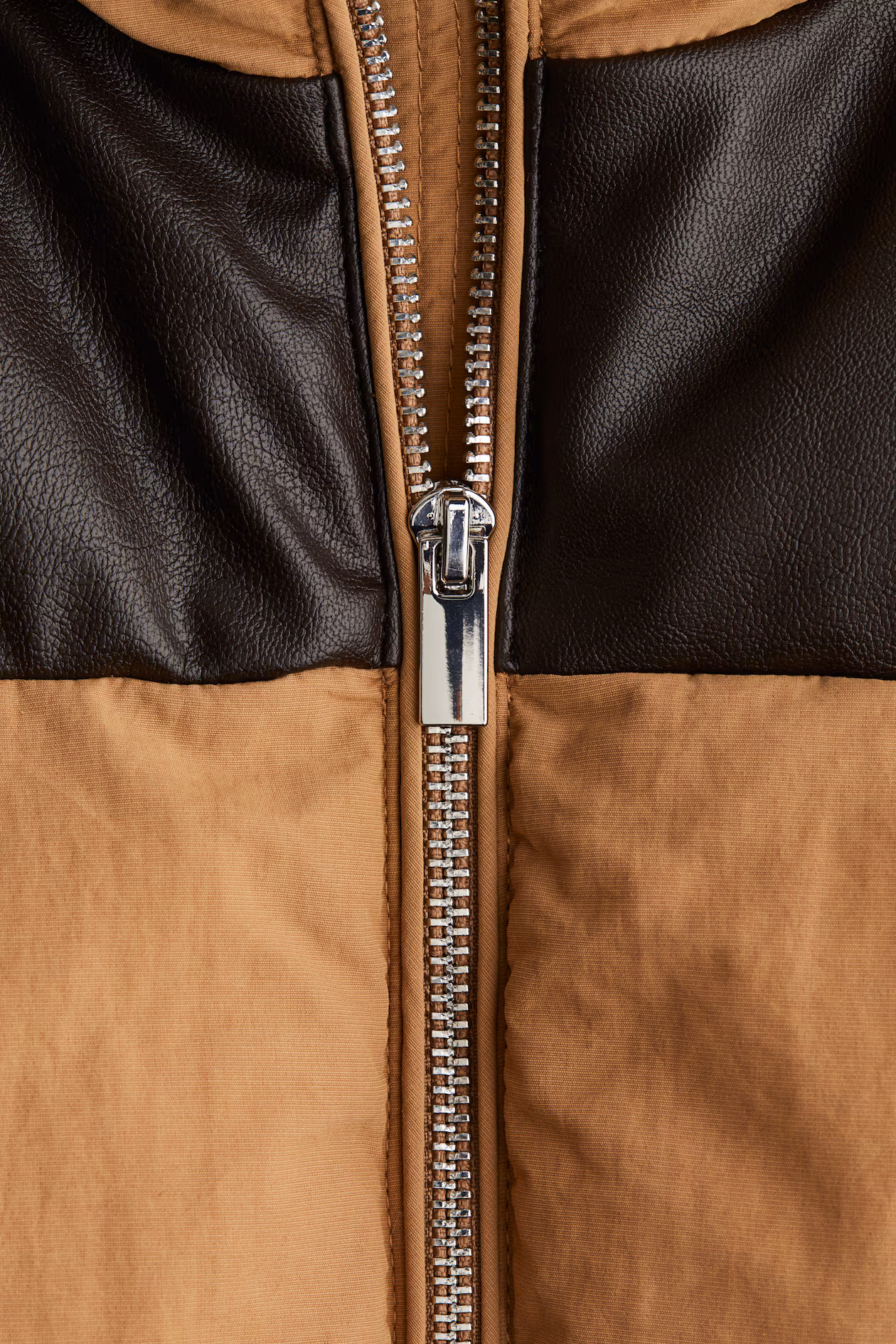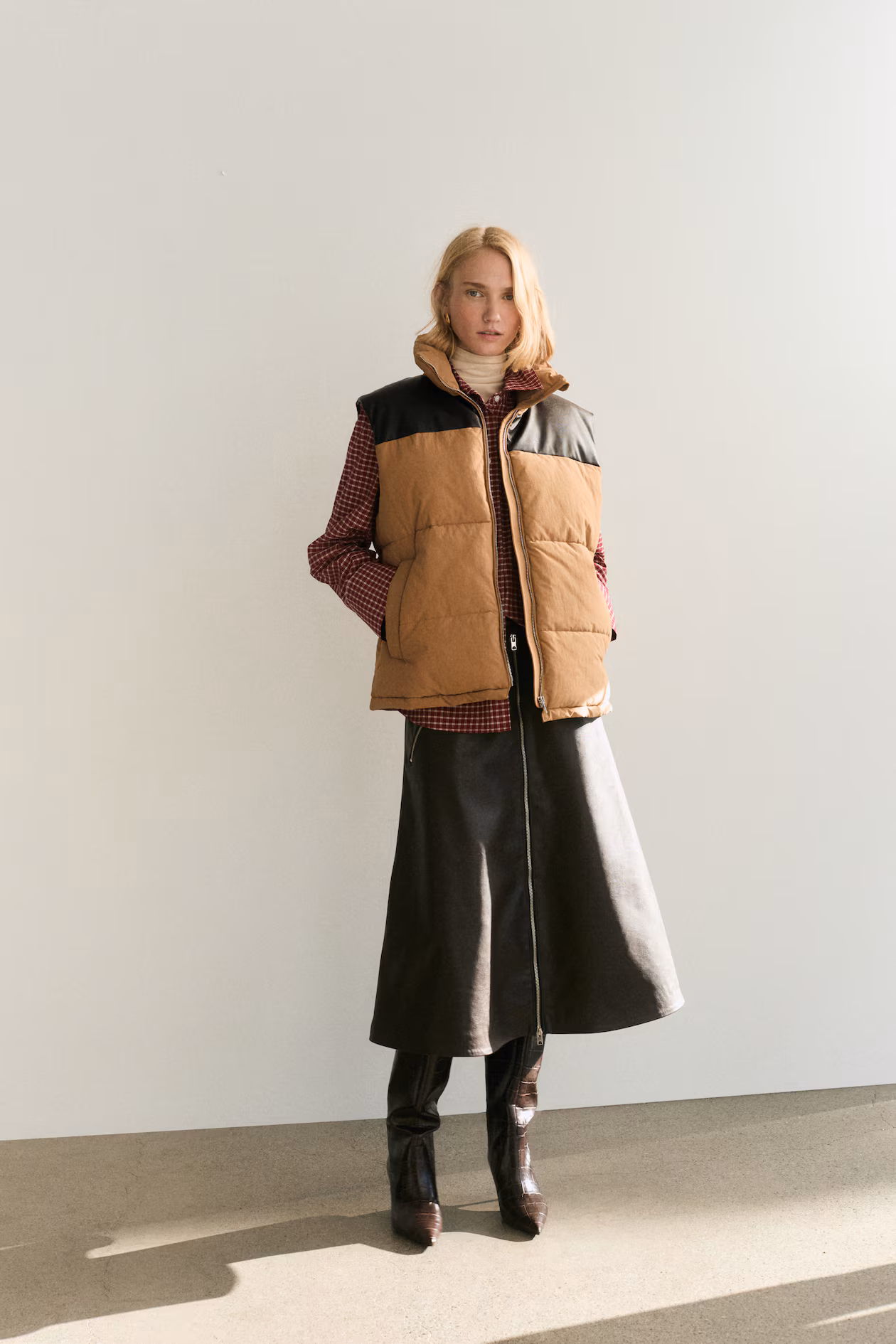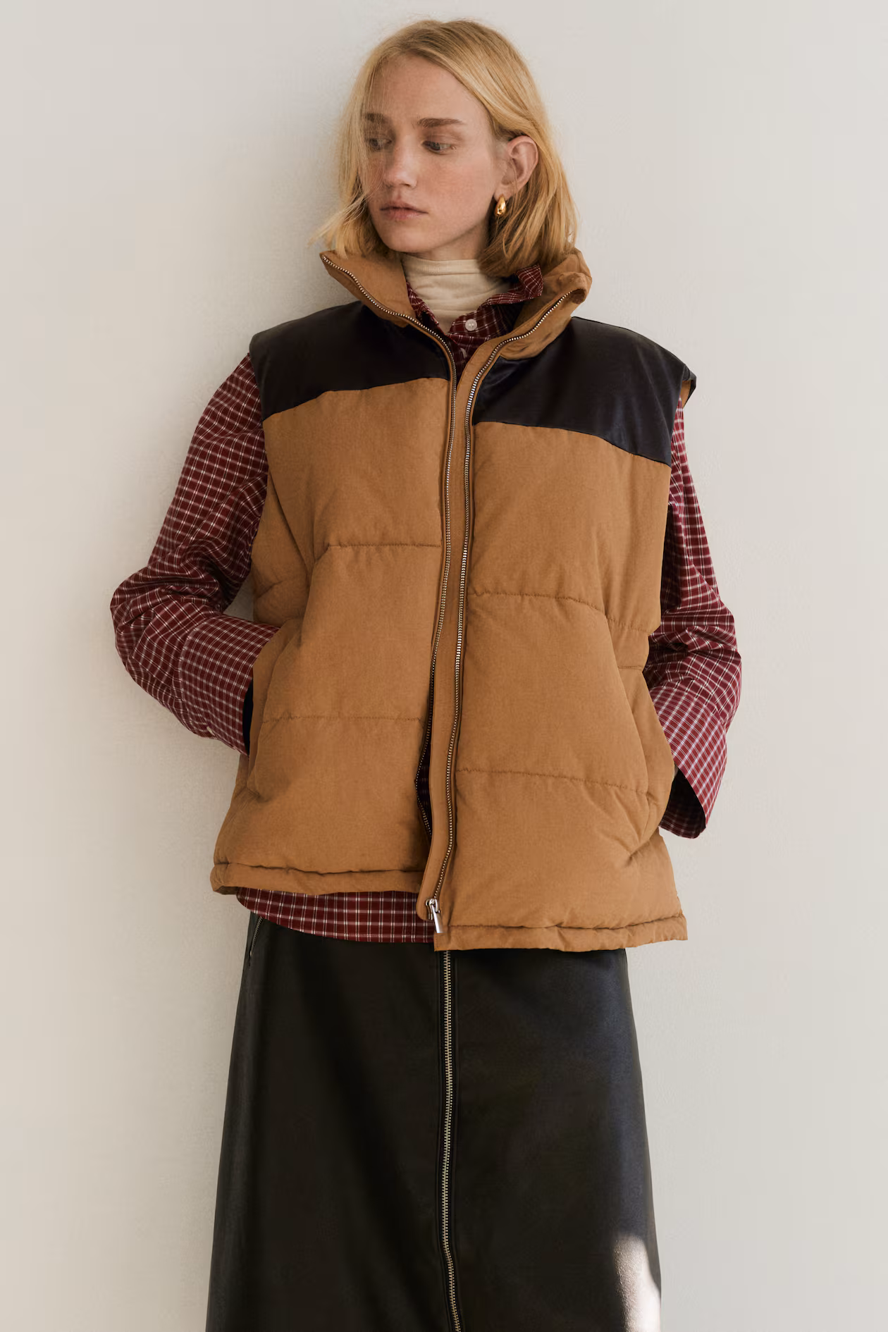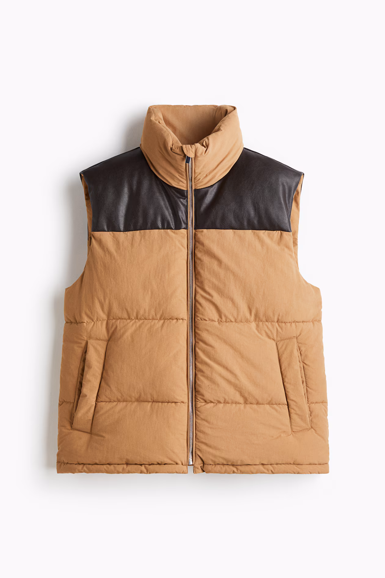 Padded vest in quilted, woven fabric featuring a yoke at front and back in coated fabric. Stand-up collar, zipper at front with anti-chafe chin guard, and welt side pockets. Lined.