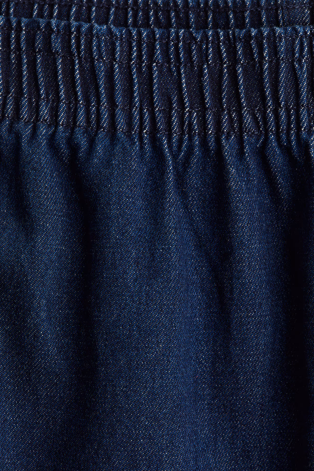 Loose-fit trousers in cotton denim with elasticated smocking at the waist. Discreet side pockets, decorative welt pockets at the back and wide legs.