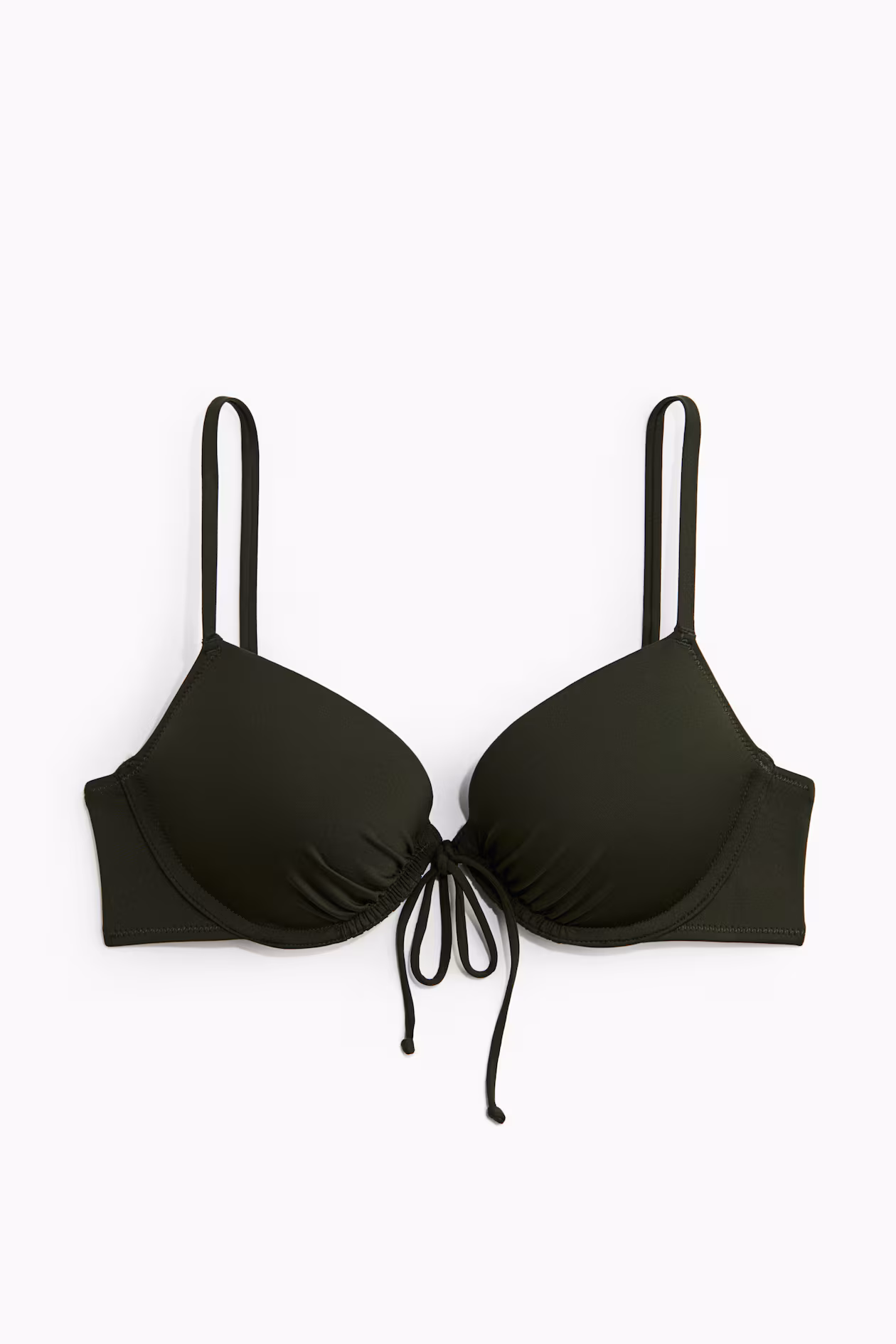 Lined bikini top with padded, underwire cups to maximize bust and cleavage. Adjustable shoulder straps, a narrow, detachable tie that can be fastened in a decorative bow at center bust, and adjustable hook fastening at back.