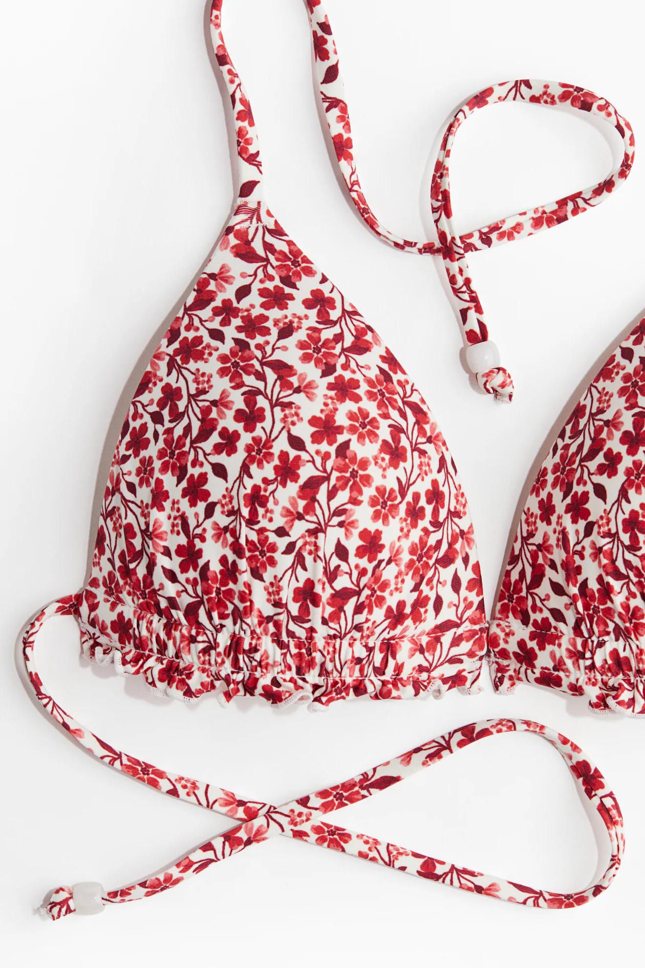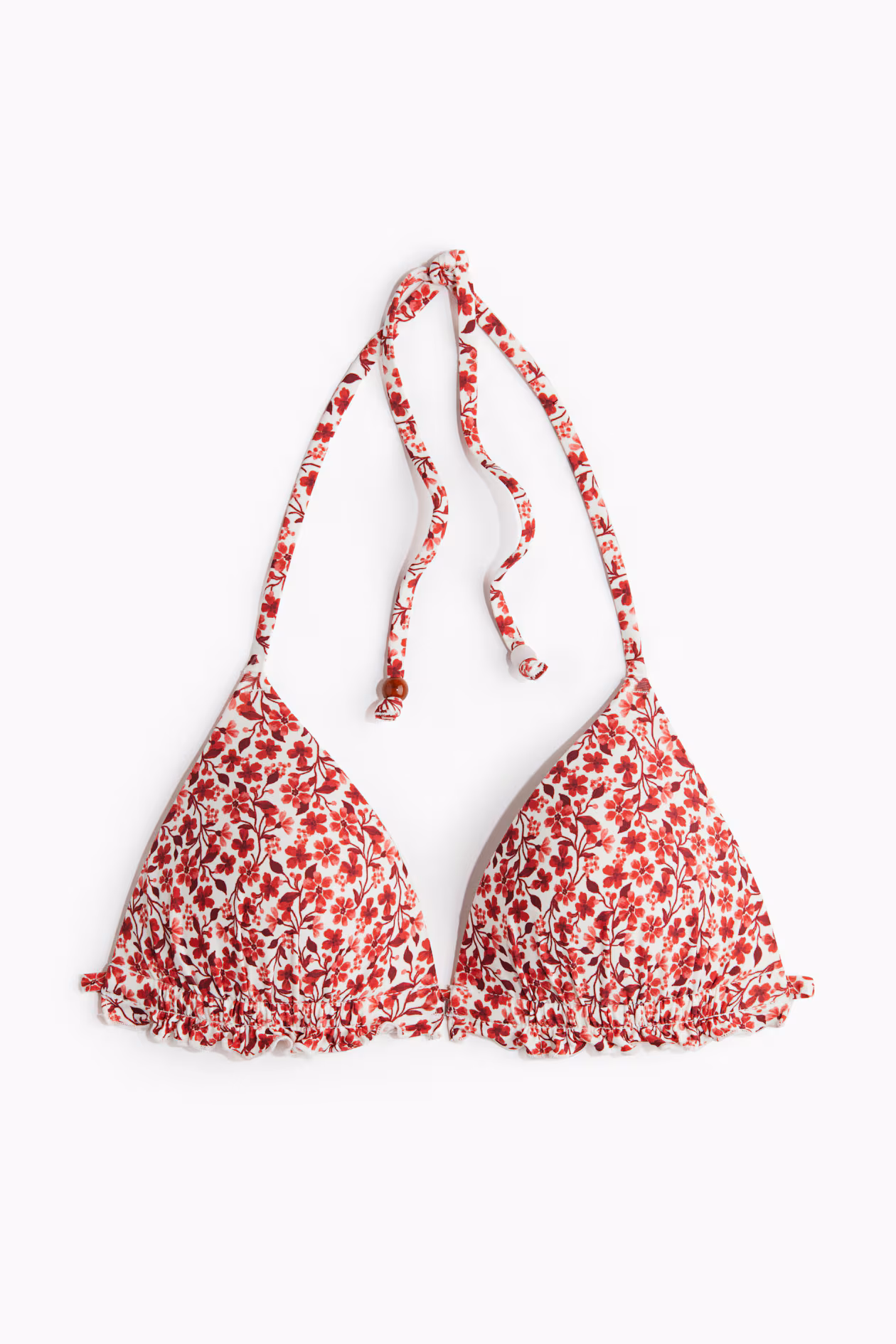 Lined triangle bikini top with ruffle-trimmed, padded cups to maximize bust and cleavage. Ties at back of neck and at back.