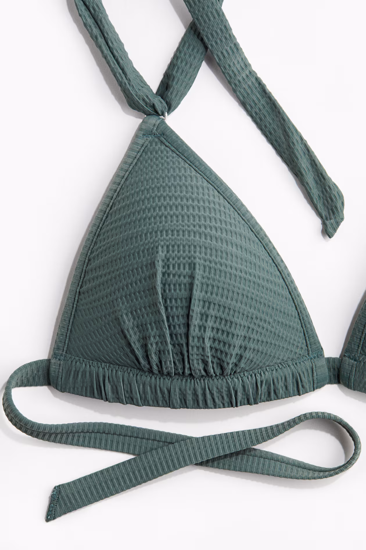 Lined, soft-cup triangle bikini top with padded cups to maximize bust and cleavage. Ties at back and double ties at back of neck.