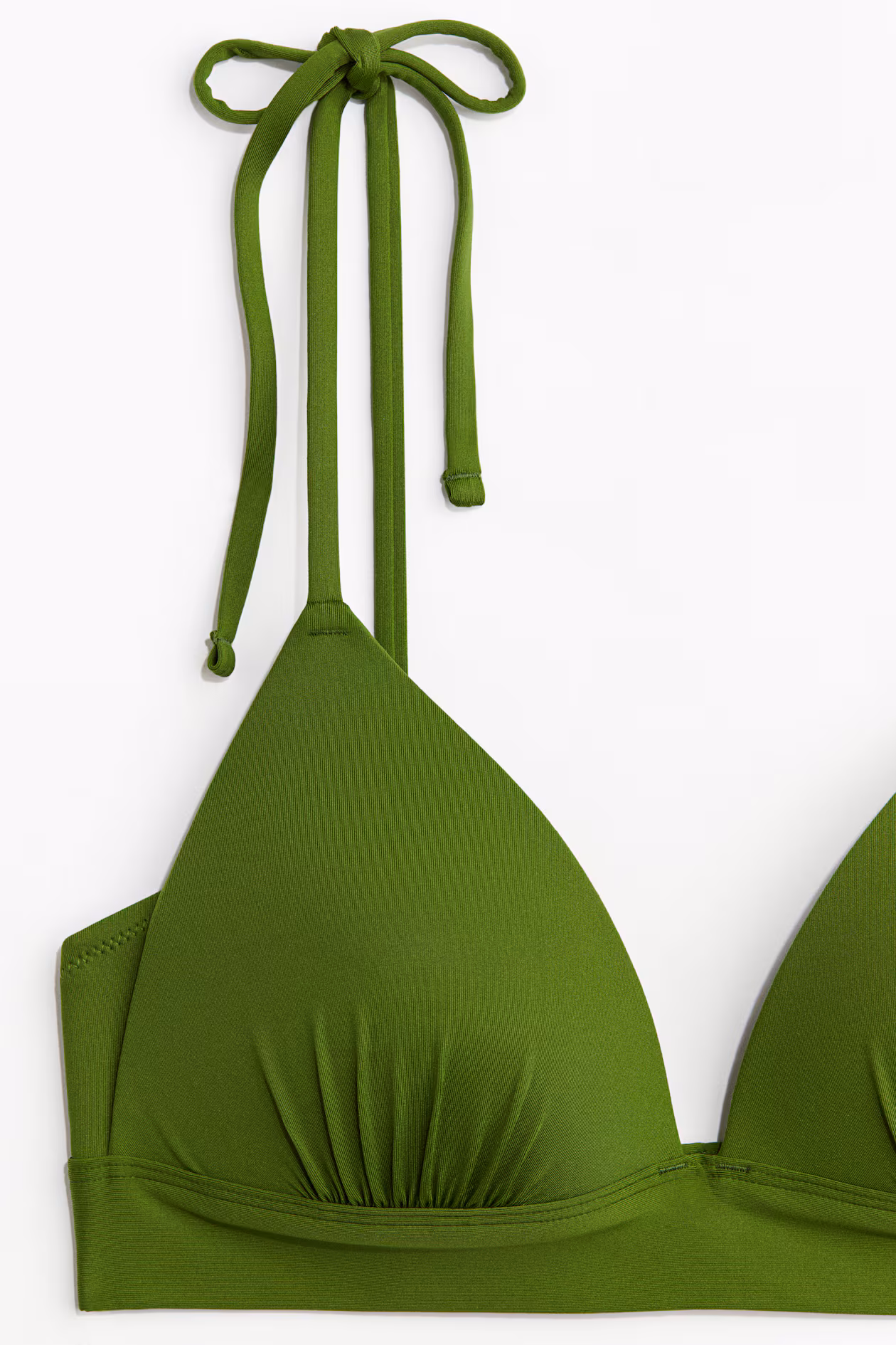 Lined triangle bikini top. Tie-top shoulder straps, padded cups to maximize bust and cleavage, and adjustable hook fastening at back.