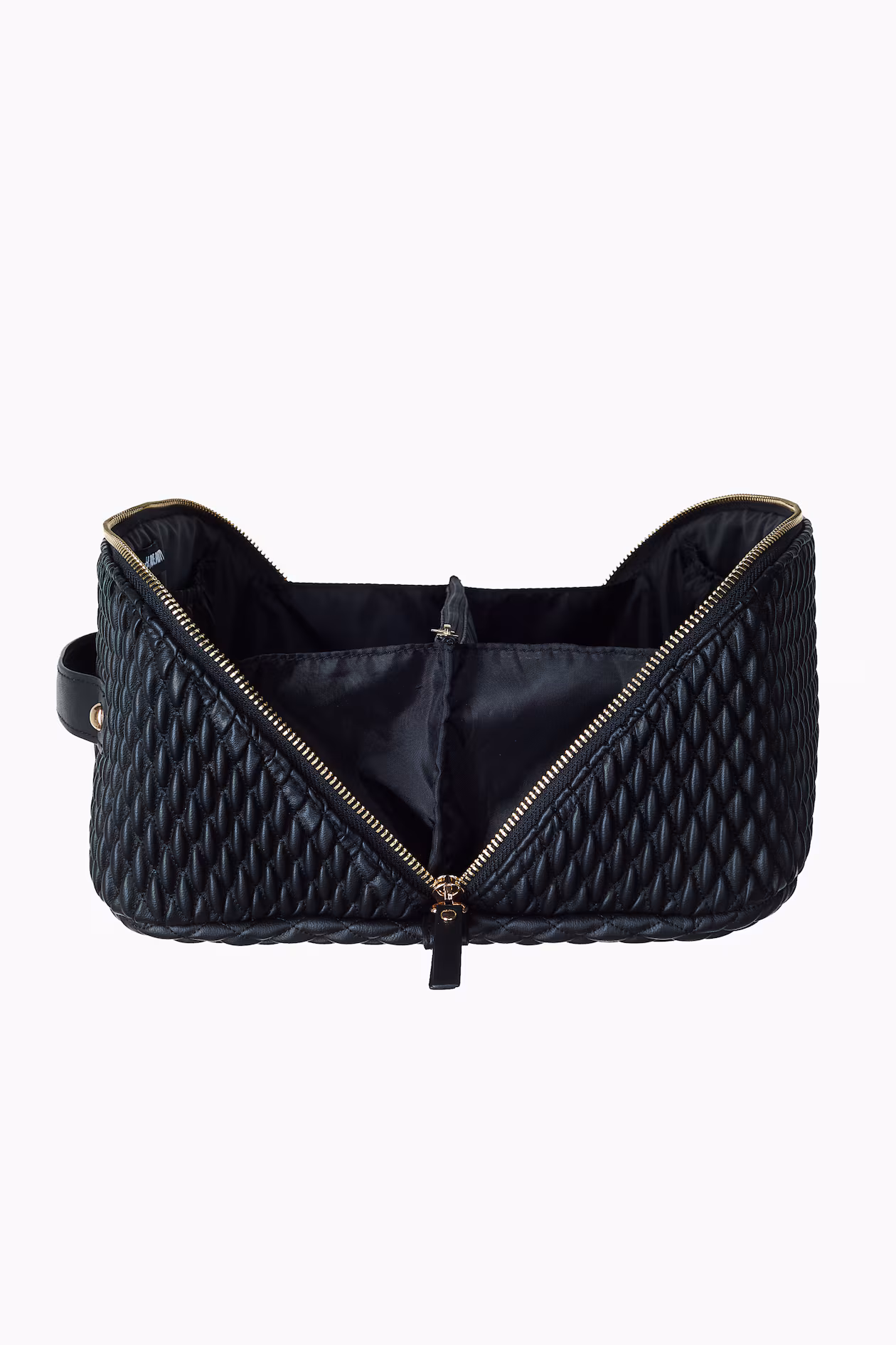 Boxy toiletry bag in quilted, coated fabric with a diagonal two-way zipper. Fully opens and can be laid flat for easy access to inner compartments.