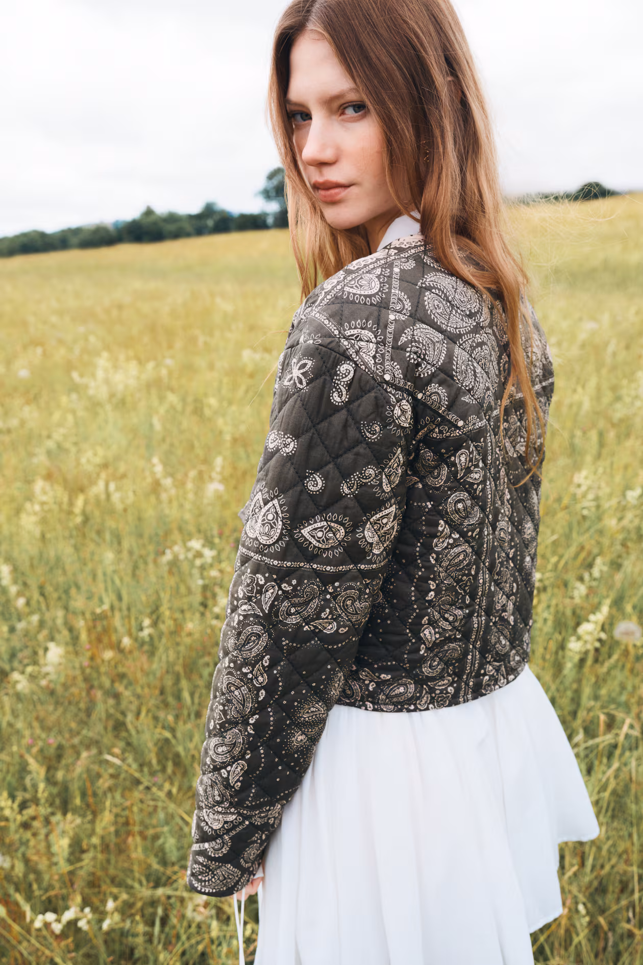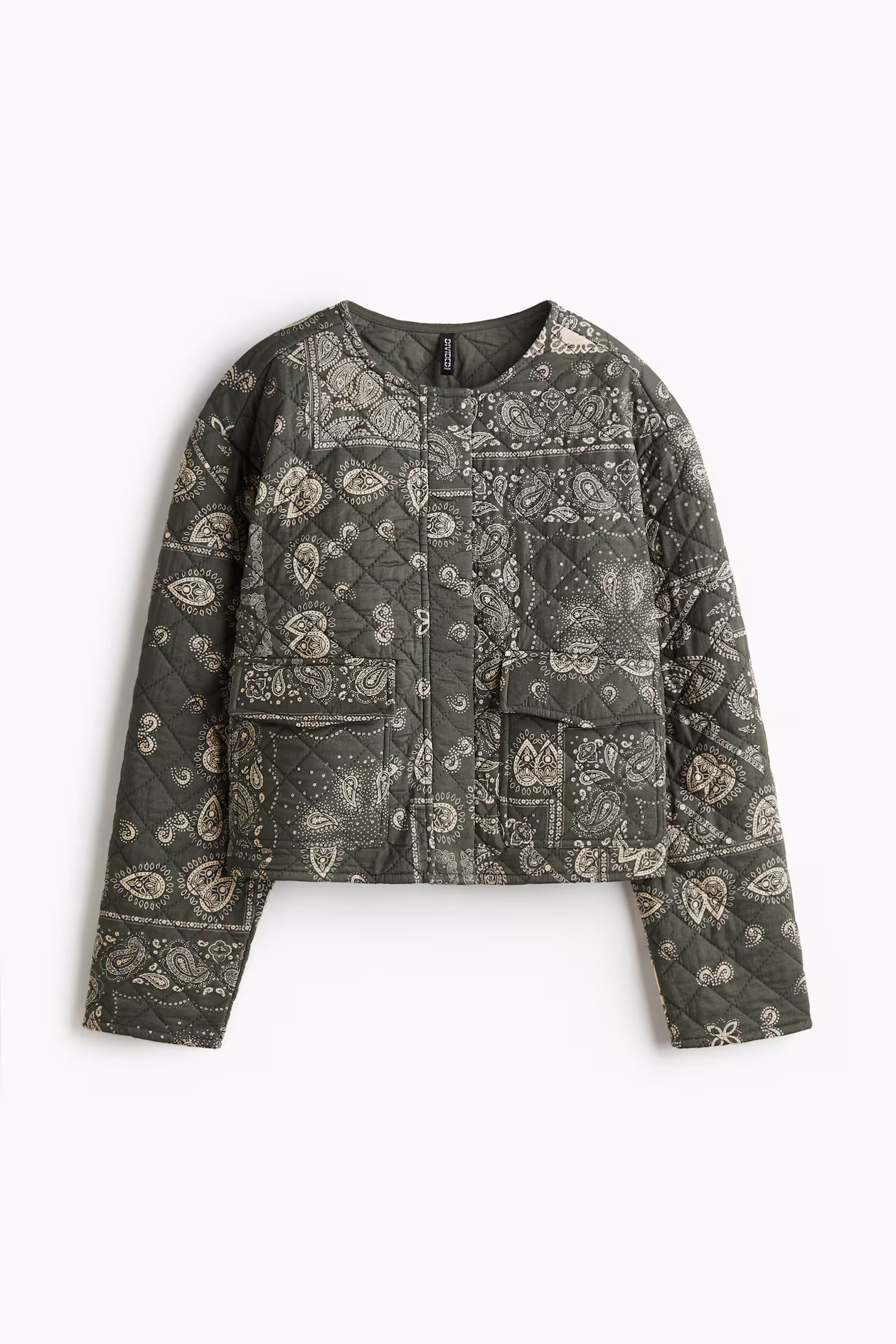 Short, lightly padded jacket in quilted woven cotton with a printed pattern. Round neckline, concealed snap fasteners at front, and front pockets with flap. Dropped shoulders, long sleeves, and a straight-cut hem. Cotton lining.