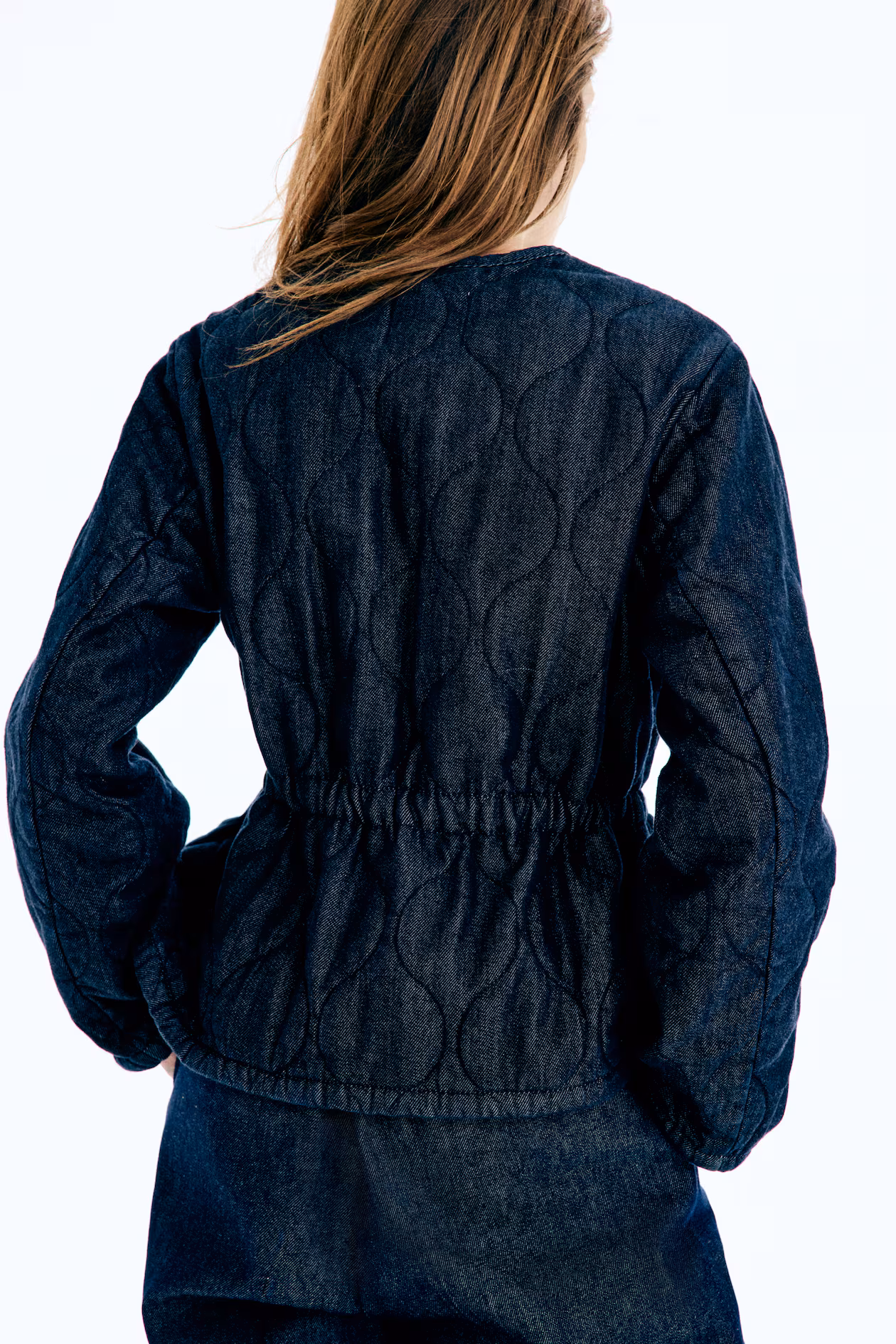 Oversized, lightly padded jacket in quilted denim made from a cotton and lyocell blend. Round neckline, concealed zipper at front, gently dropped shoulders, and a drawstring at waist. Lined.