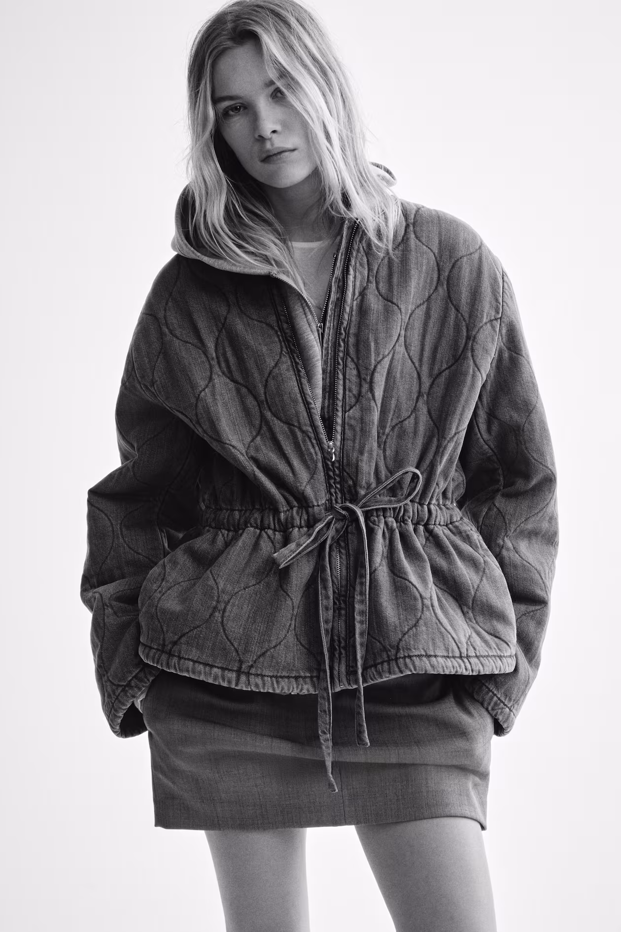 Oversized, lightly padded jacket in quilted denim made from a cotton and lyocell blend. Round neckline, concealed zipper at front, gently dropped shoulders, and a drawstring at waist. Lined.