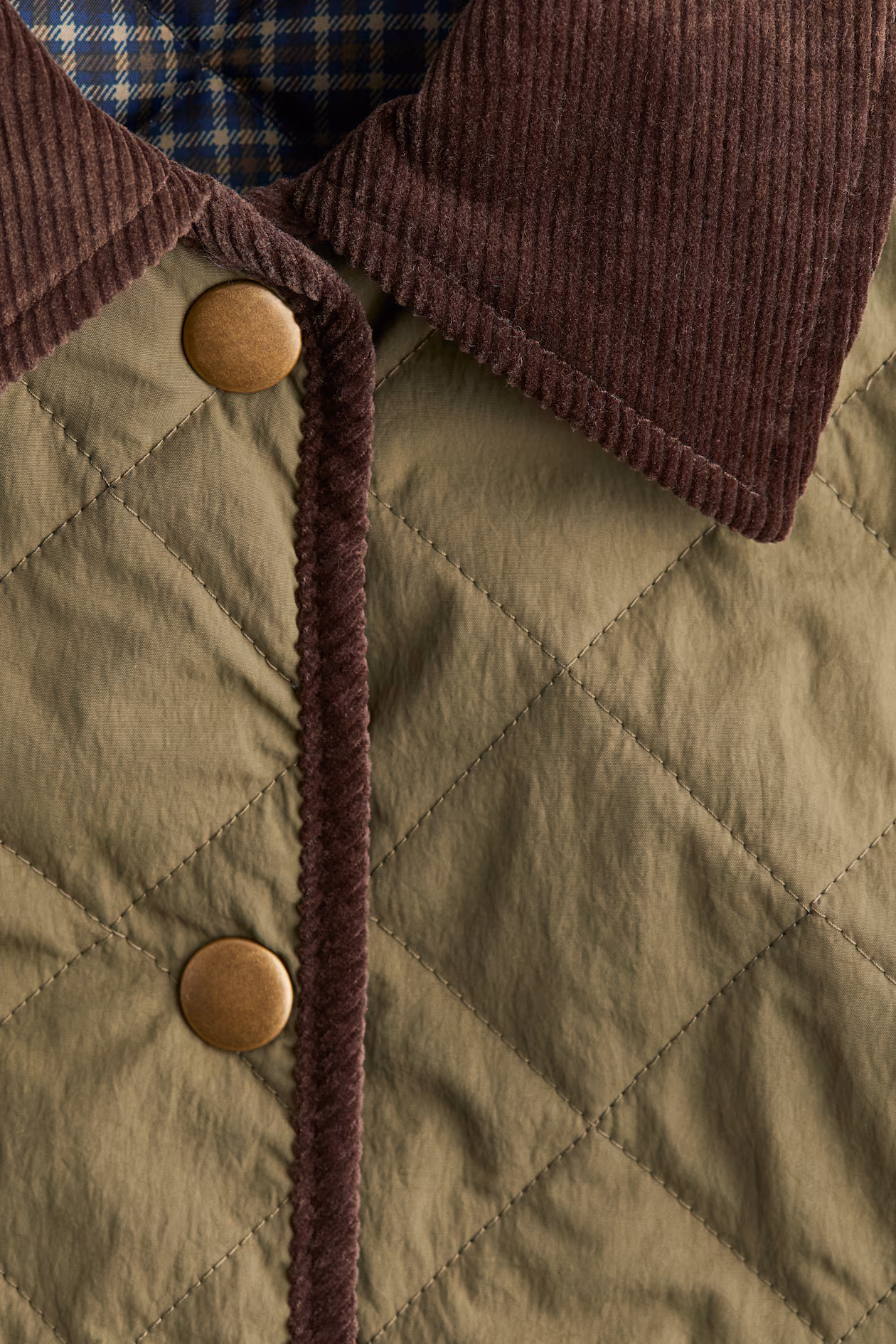 Short, lightly padded jacket in quilted nylon with collar and narrow trim in corduroy. Snap fasteners at front, front pockets with flap and concealed snap fasteners, dropped shoulders, and long sleeves. Straight-cut hem. Lined.