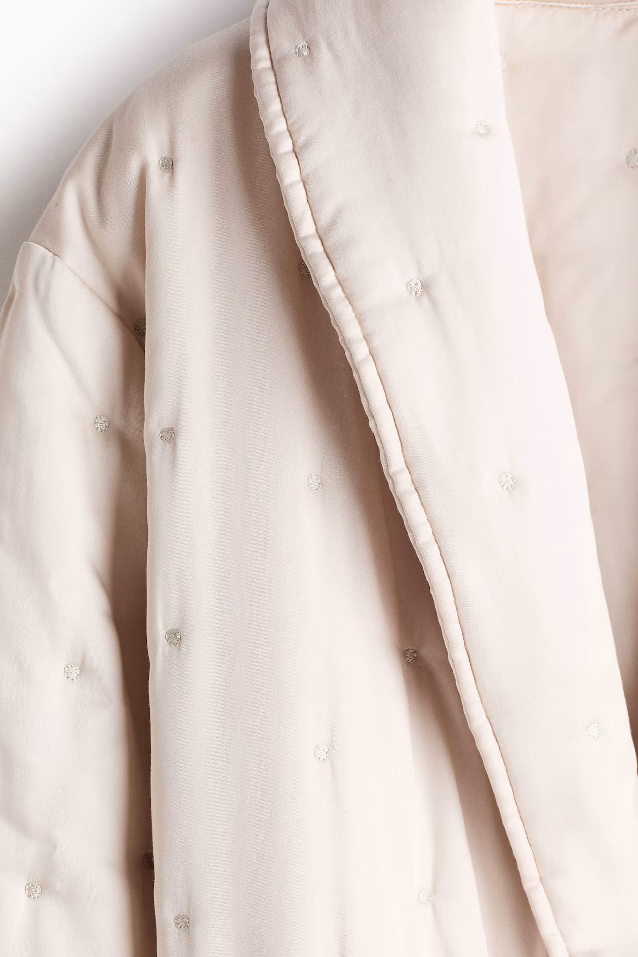 Bathrobe in padded woven fabric with tufting. Shawl collar, discreet side pockets, and removable tie belt at waist.