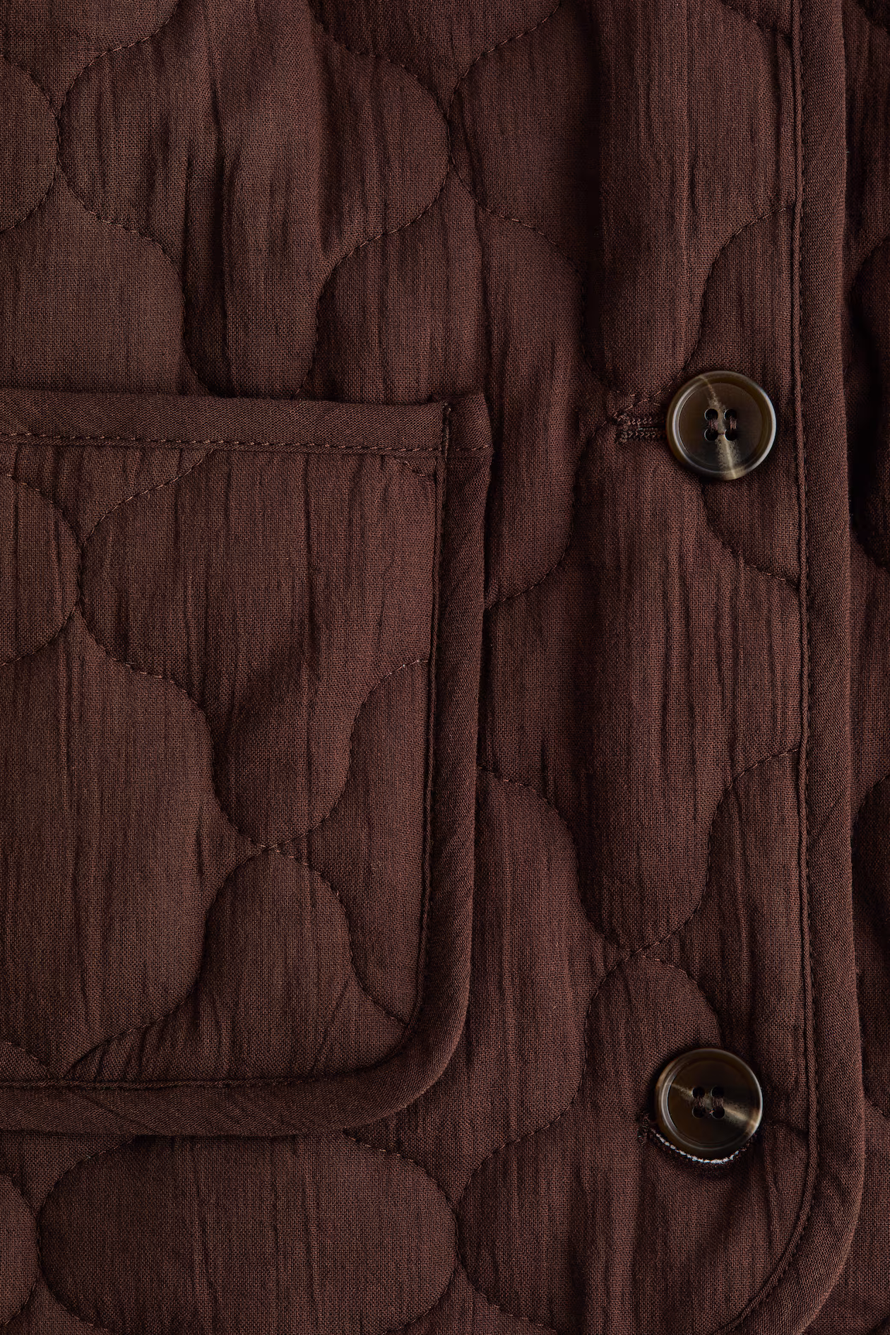 Fitted, lightly padded vest in quilted, crinkled woven cotton with binding at edges. Round neckline, buttons at front, and patch front pockets. Lined.