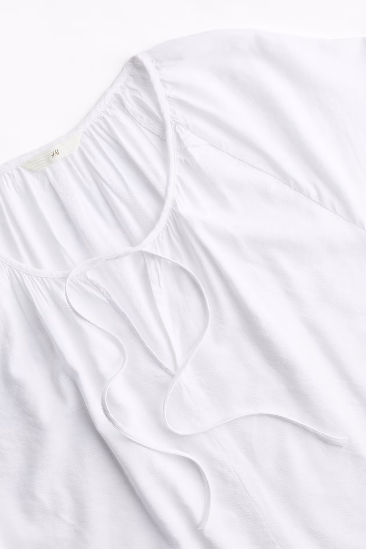 Loose-fit blouse in airy, woven fabric. Round neckline with soft gathers, V-shaped opening at front with narrow ties, and short raglan sleeves.