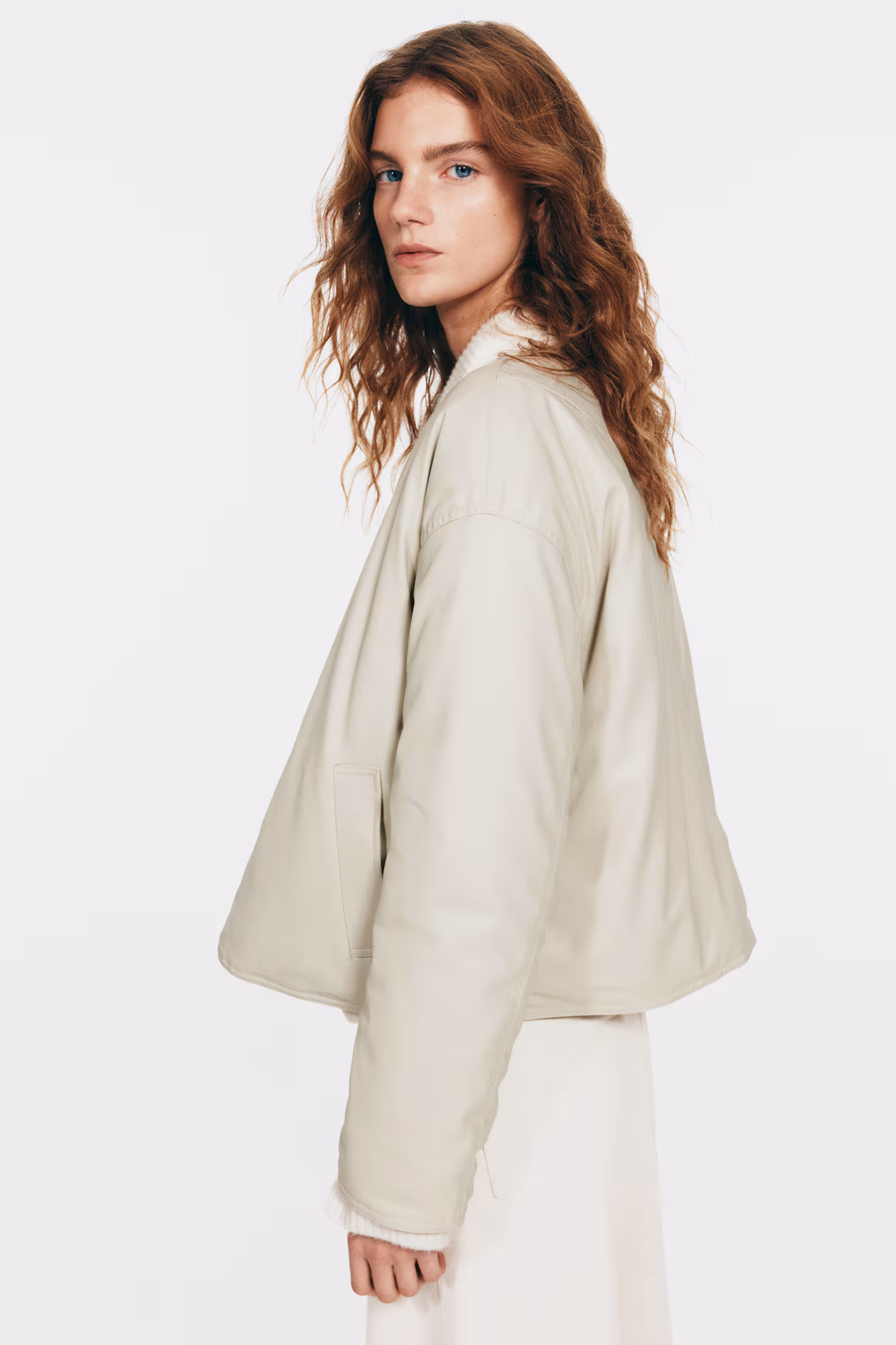 Short, oversized reversible bomber jacket with one side in coated fabric and one side in woven cotton. Round neckline, snap fasteners at front, gently dropped shoulders, and welt front pockets.