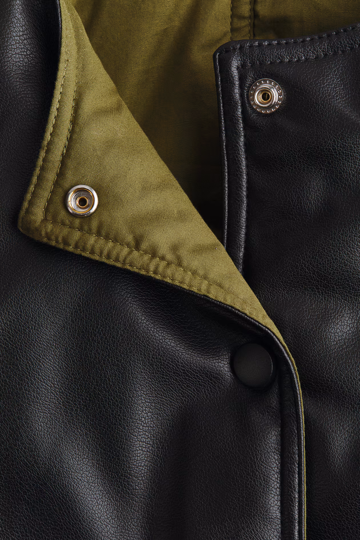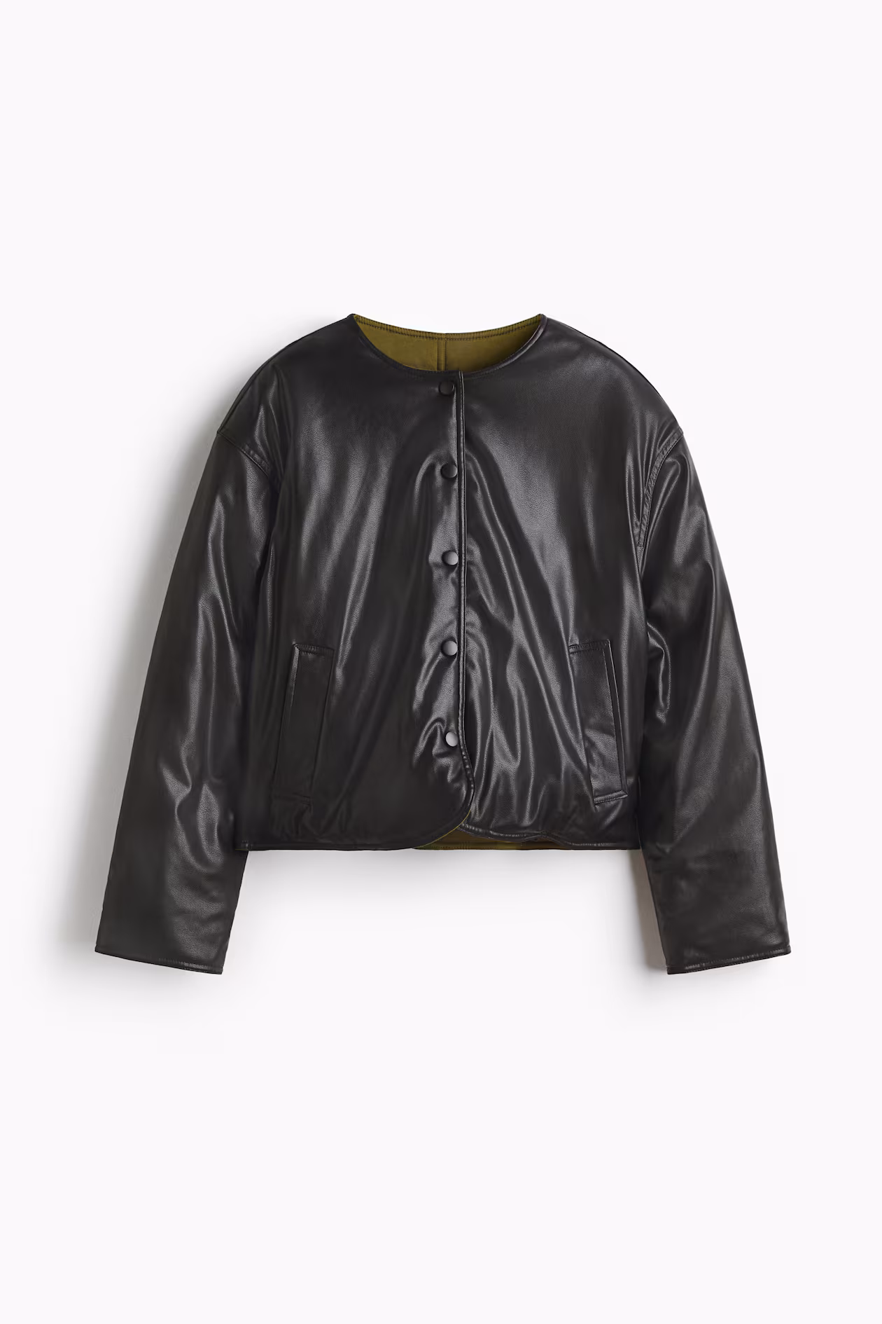 Short, oversized reversible bomber jacket with one side in coated fabric and one side in woven cotton. Round neckline, snap fasteners at front, gently dropped shoulders, and welt front pockets.