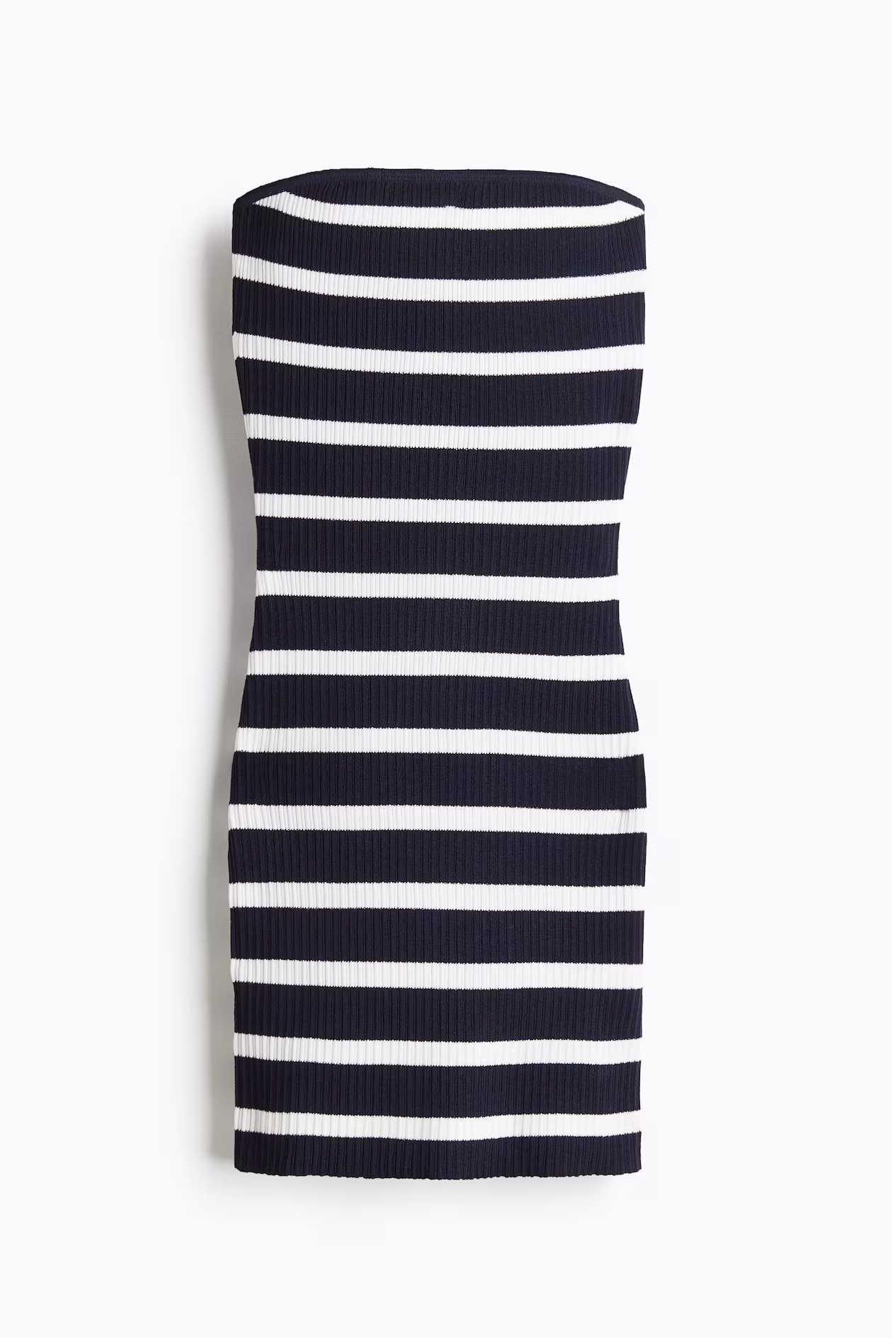 Short, fitted bandeau dress in a soft rib knit. Silicone trim inside upper edge.