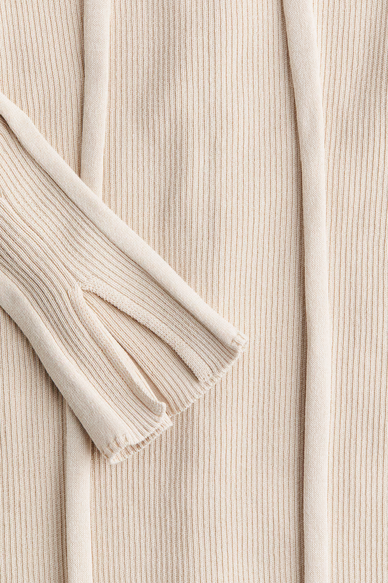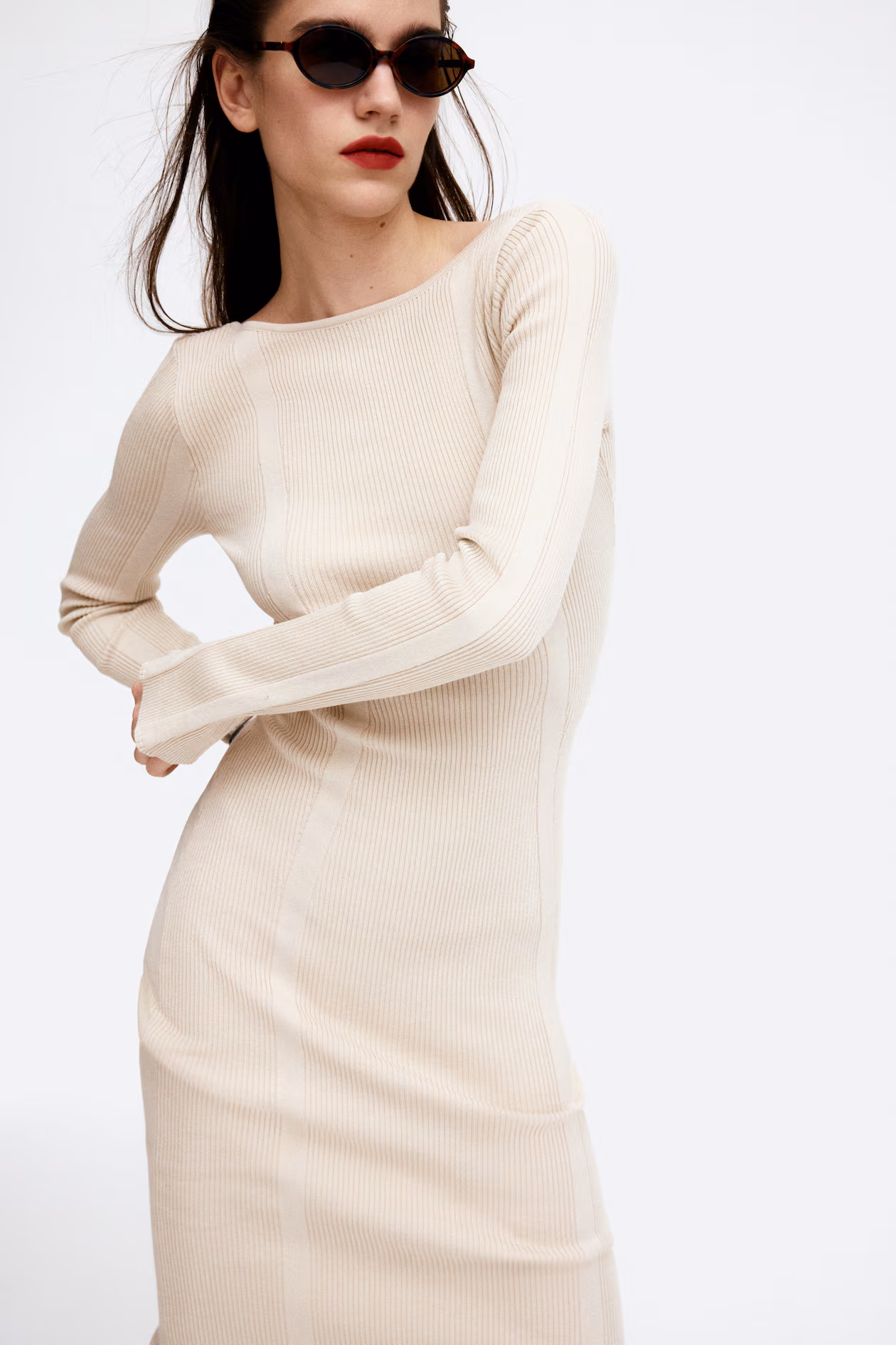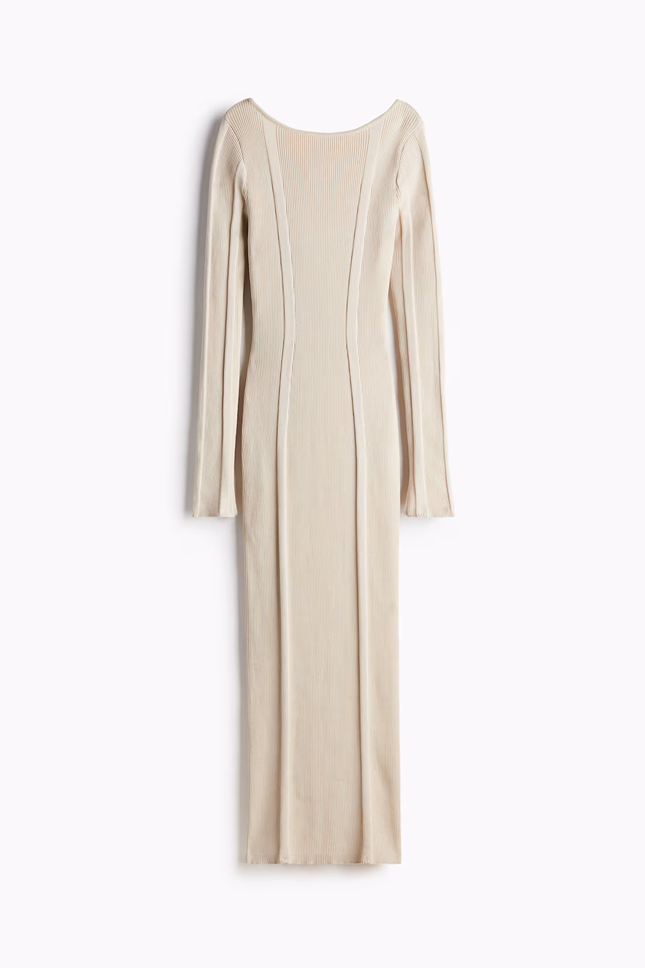 Long, fitted dress in a rib knit. Wide neckline, low-cut back, and long sleeves with slit at cuffs.