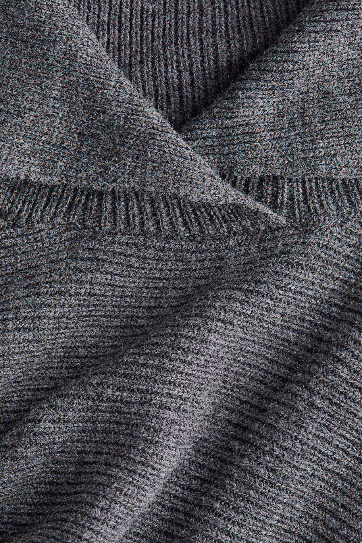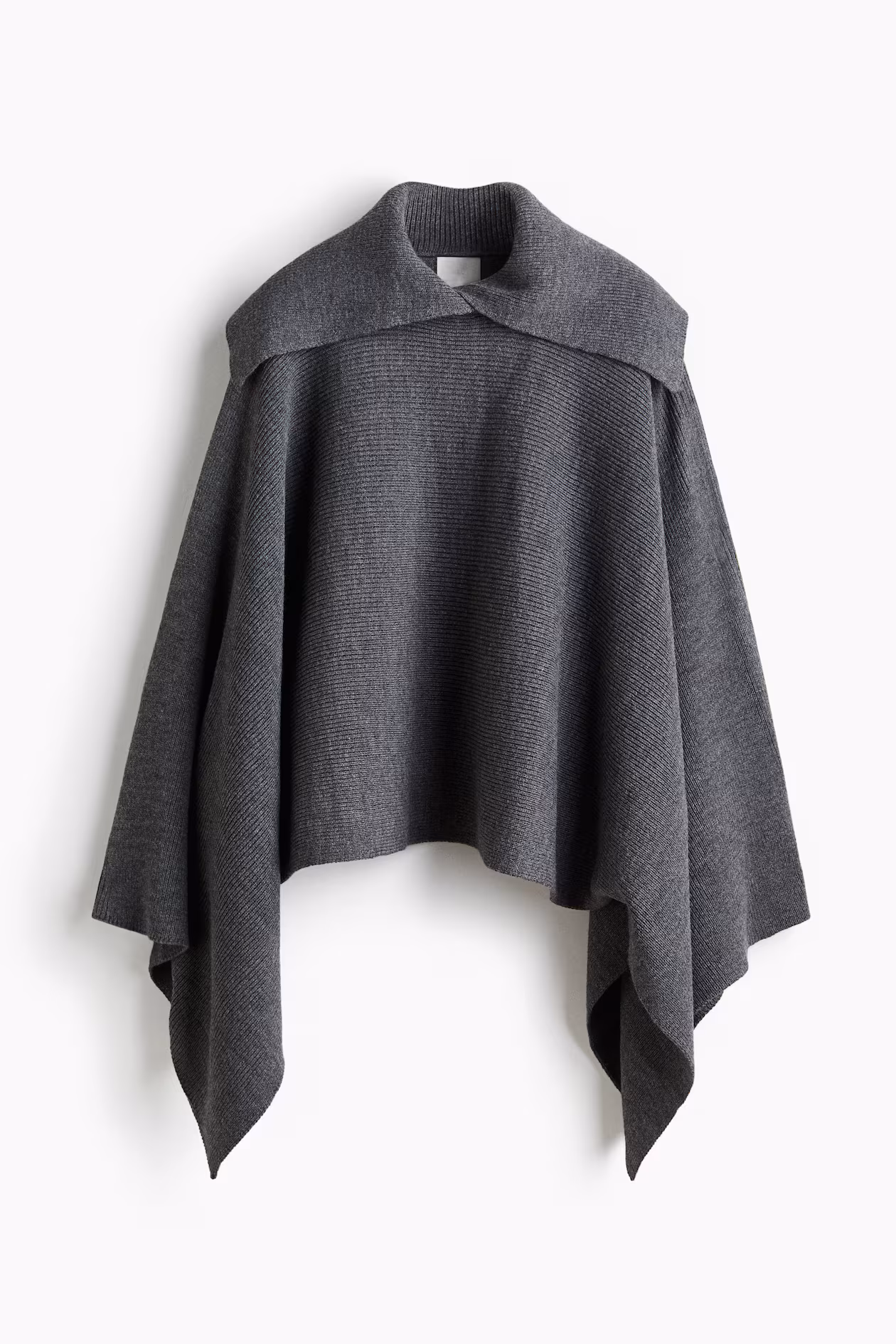 Soft, rib-knit cape with a wide collar that overlaps at front.