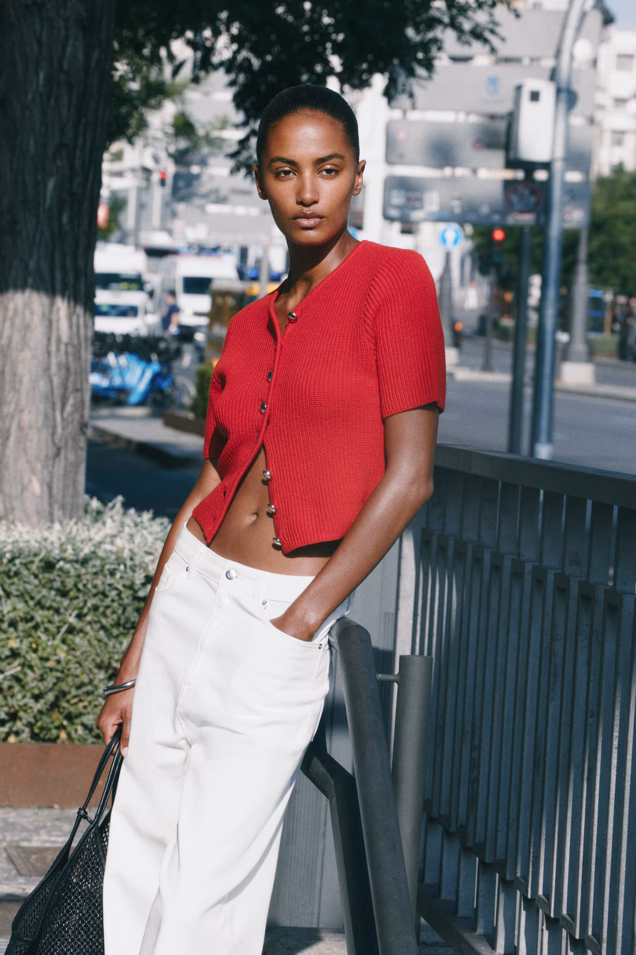 Short, fitted cardigan in a rib-knit cotton blend. Round neckline, metal buttons at front, and short sleeves.