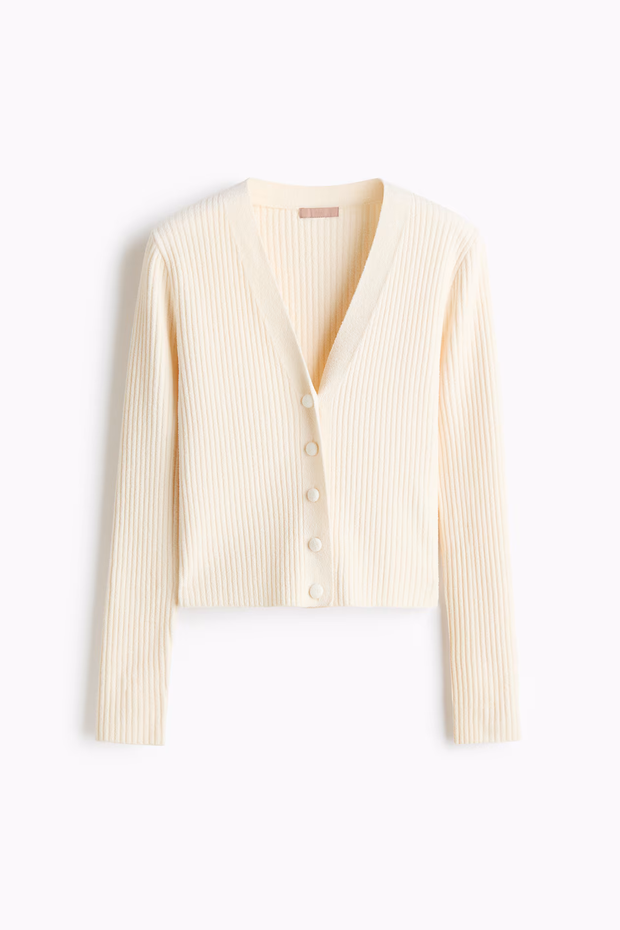 Short, fitted cardigan in a soft rib knit. V-neck and covered buttons at front.