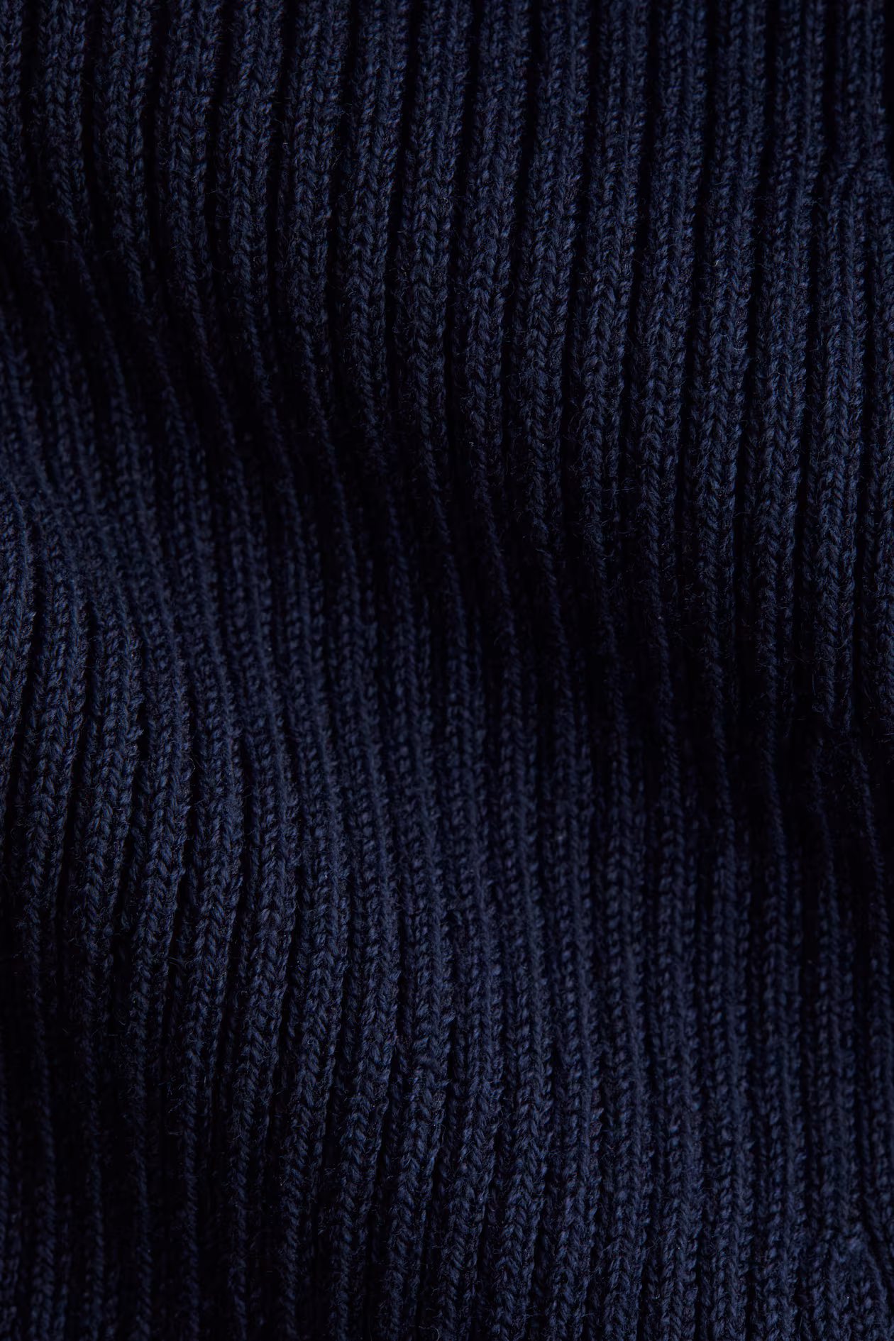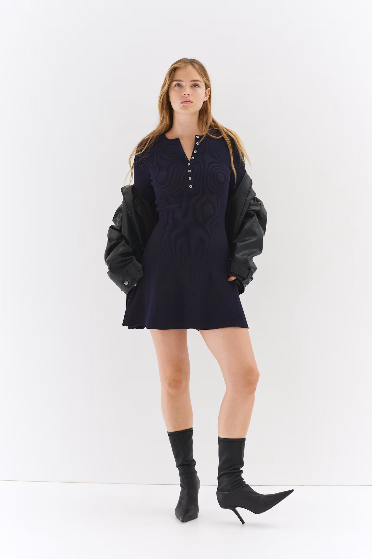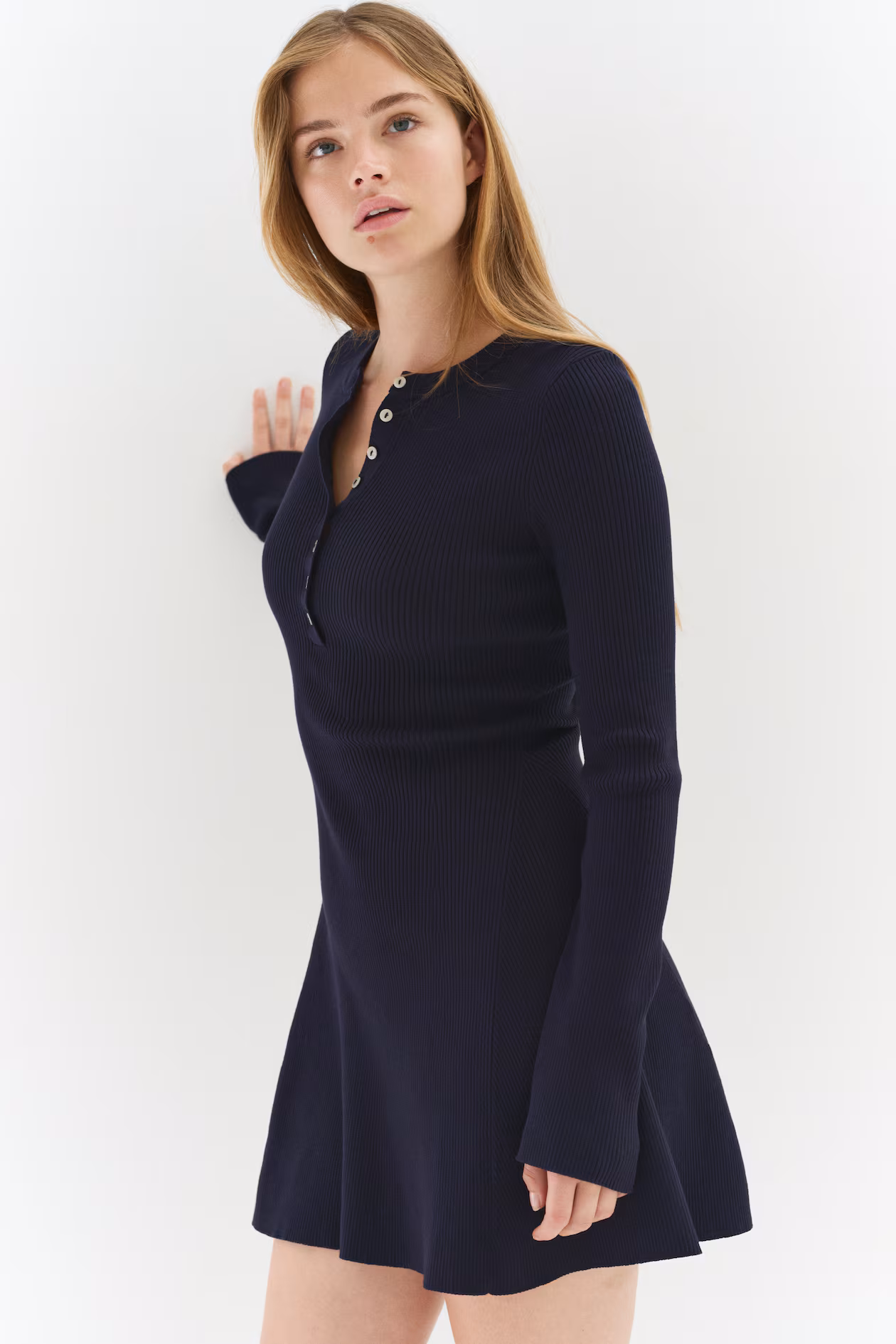 Short, rib-knit dress with a fitted bodice and flared skirt. Round neckline, button placket, and long sleeves.