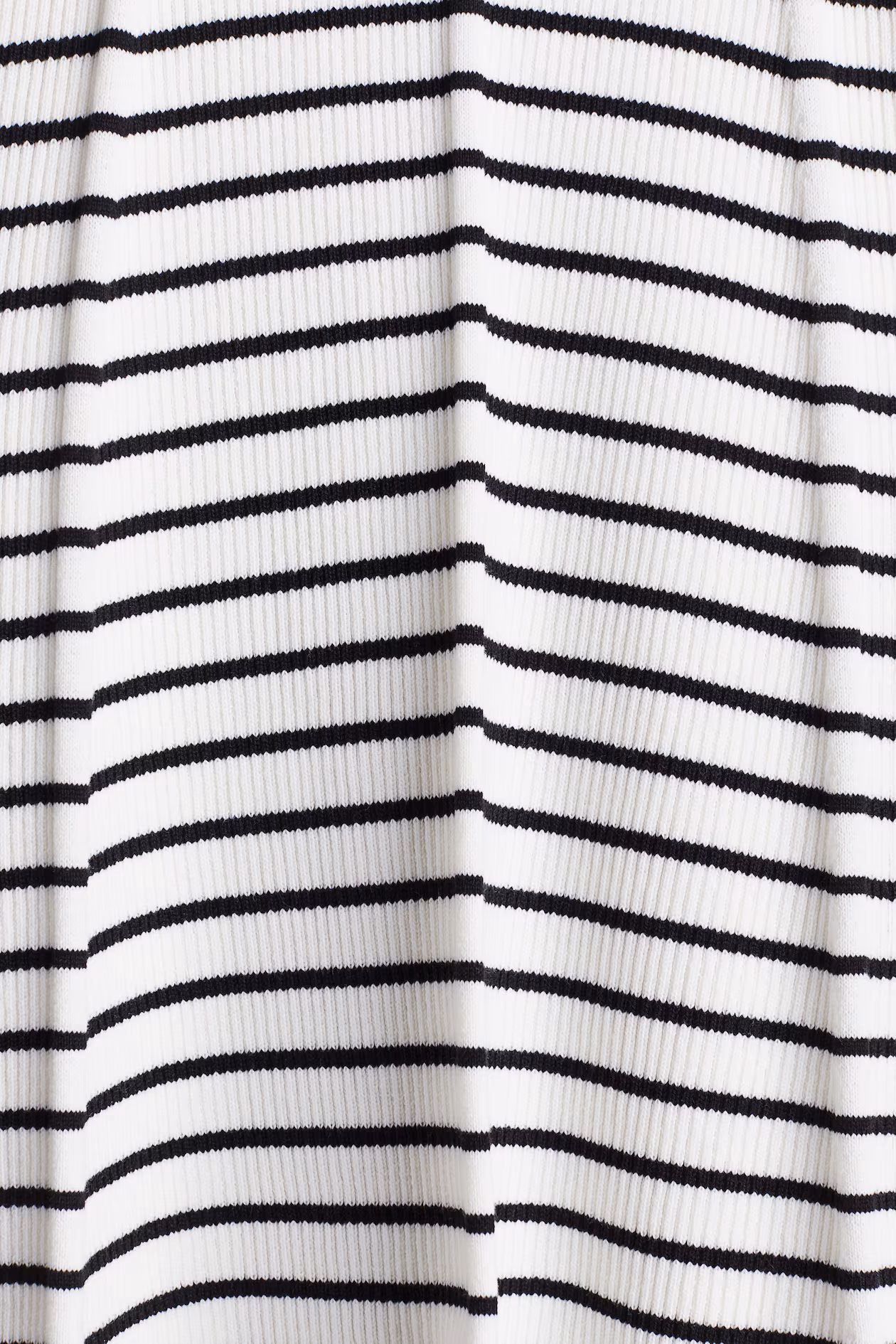 Short dress in an irregular rib knit with a fitted bodice and flared skirt. Round neckline and short sleeves.