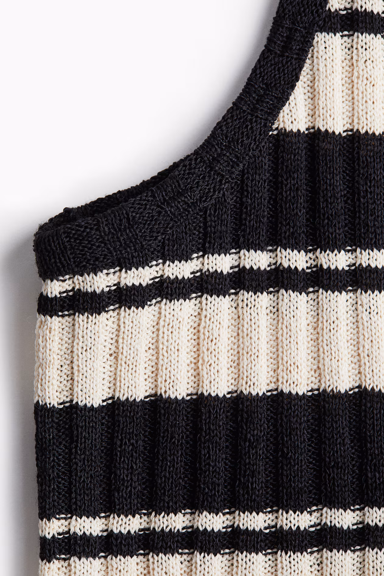 Fitted, sleeveless dress in a rib knit. Scoop neck at front and back and a straight hem with slit at back.