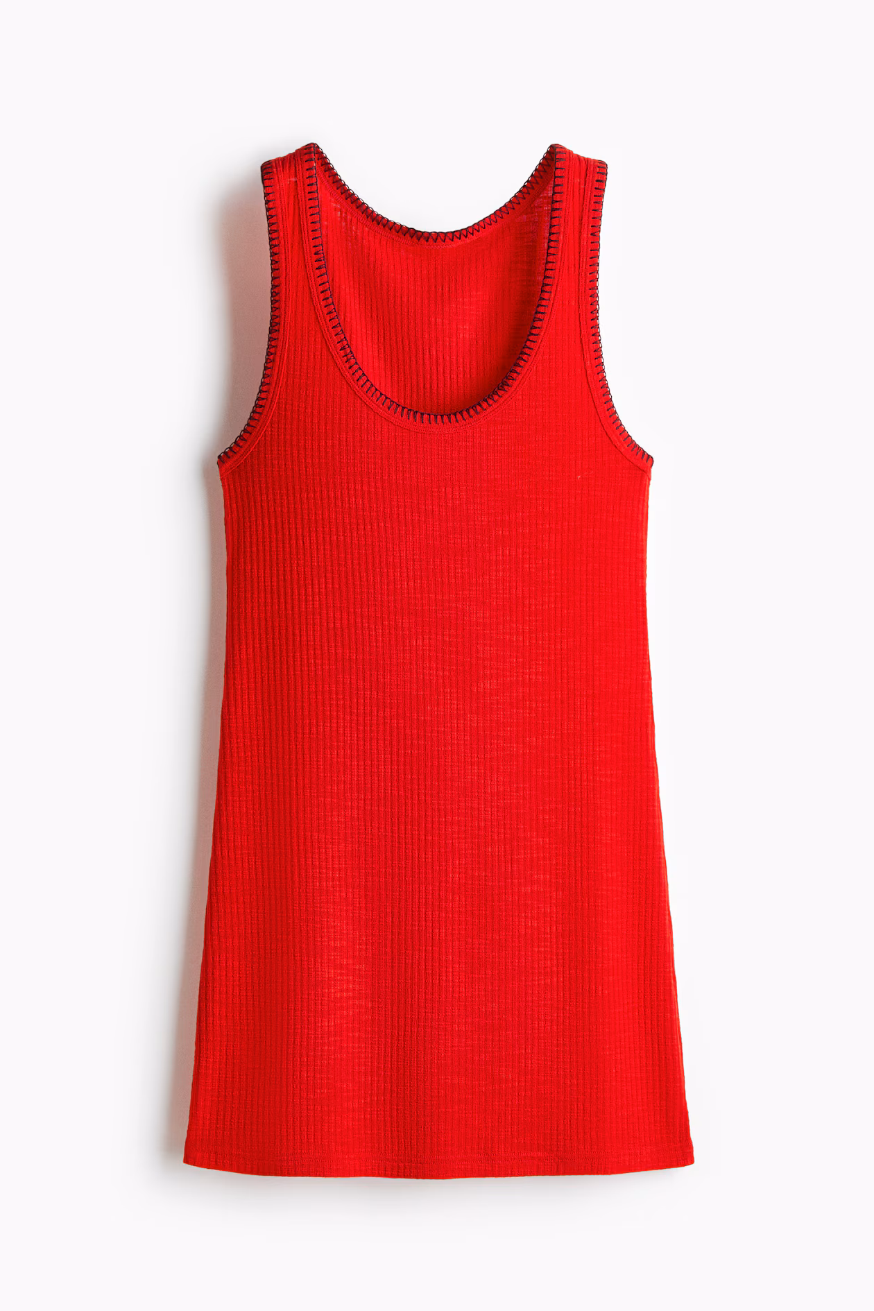 Short, sleeveless dress in a soft rib knit with a round neckline. Contrasting whipstitching at neckline and armholes.