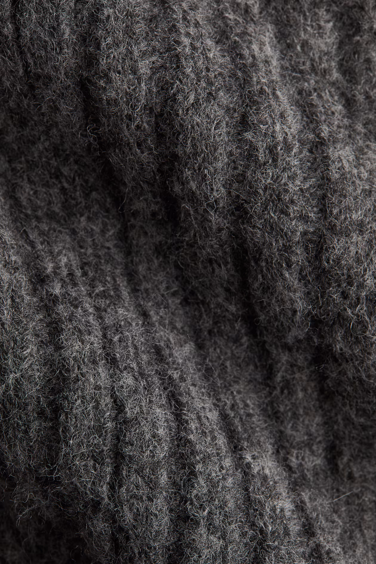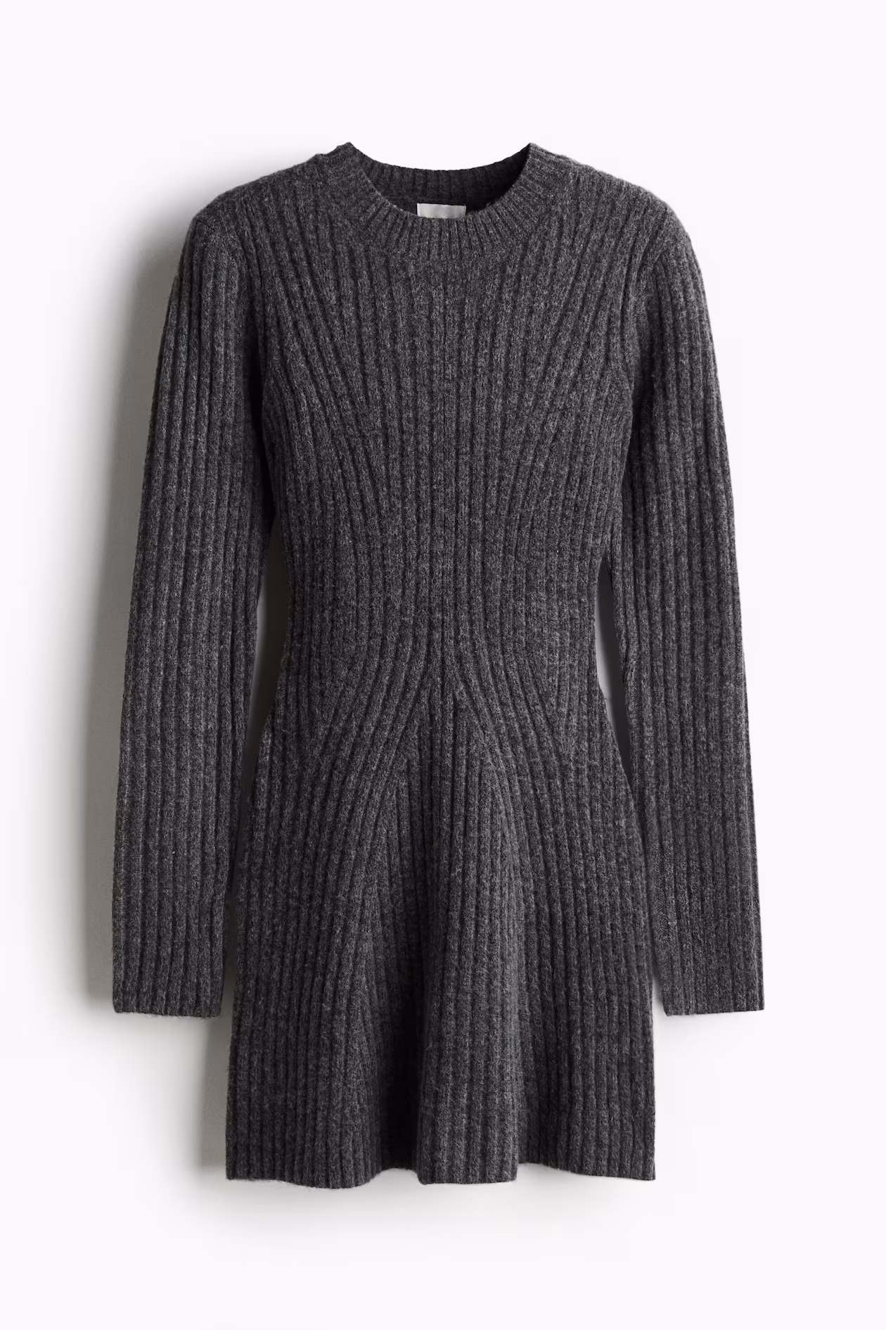 Short, fitted dress in a soft rib knit with a fully-fashioned section at front and back. Round neckline, gently dropped shoulders, and long sleeves with flared, slit cuffs. Gently flared skirt.
