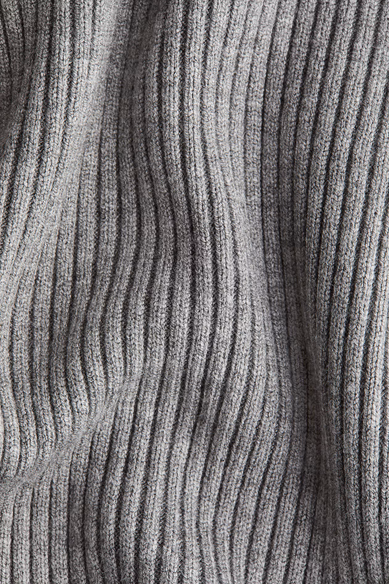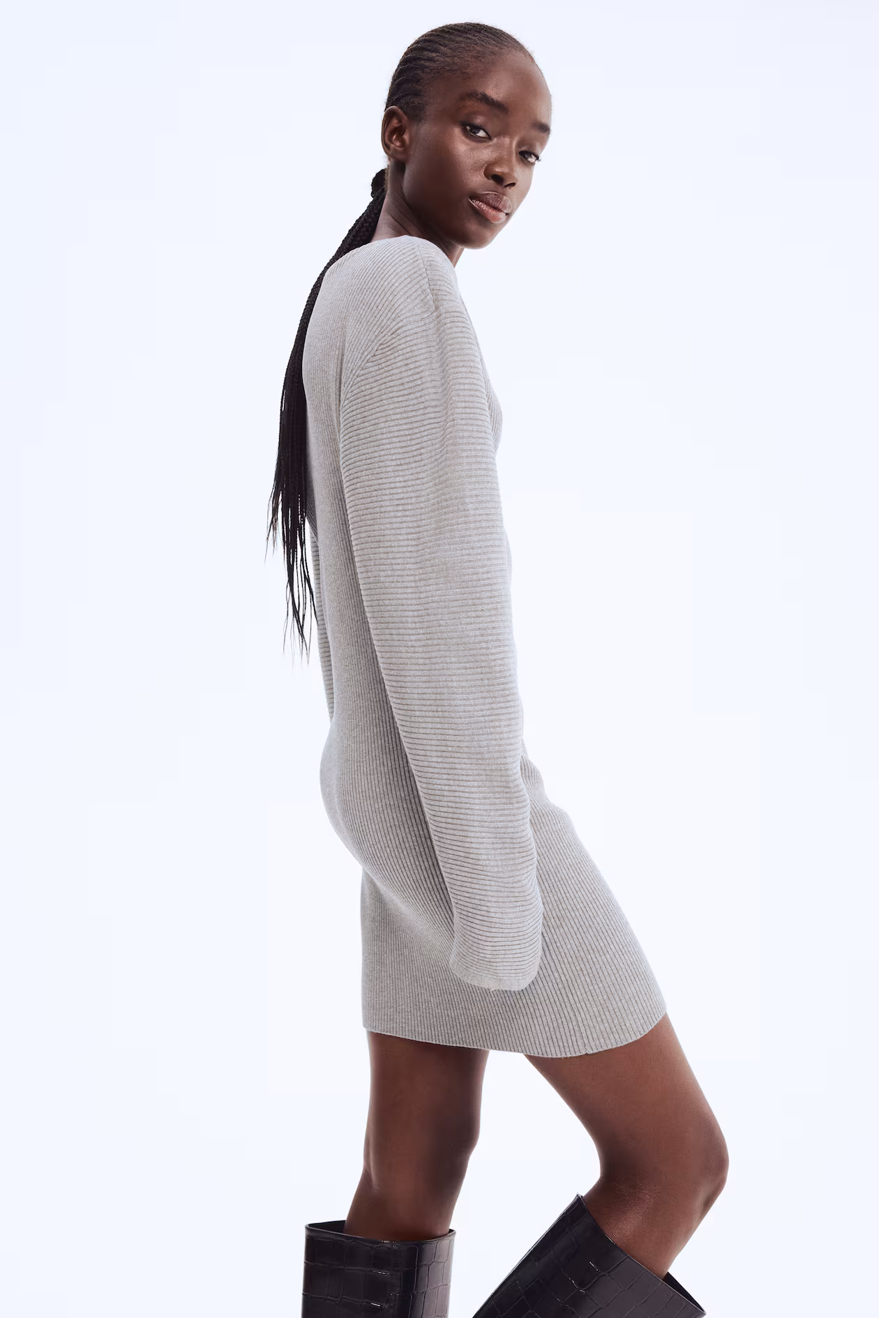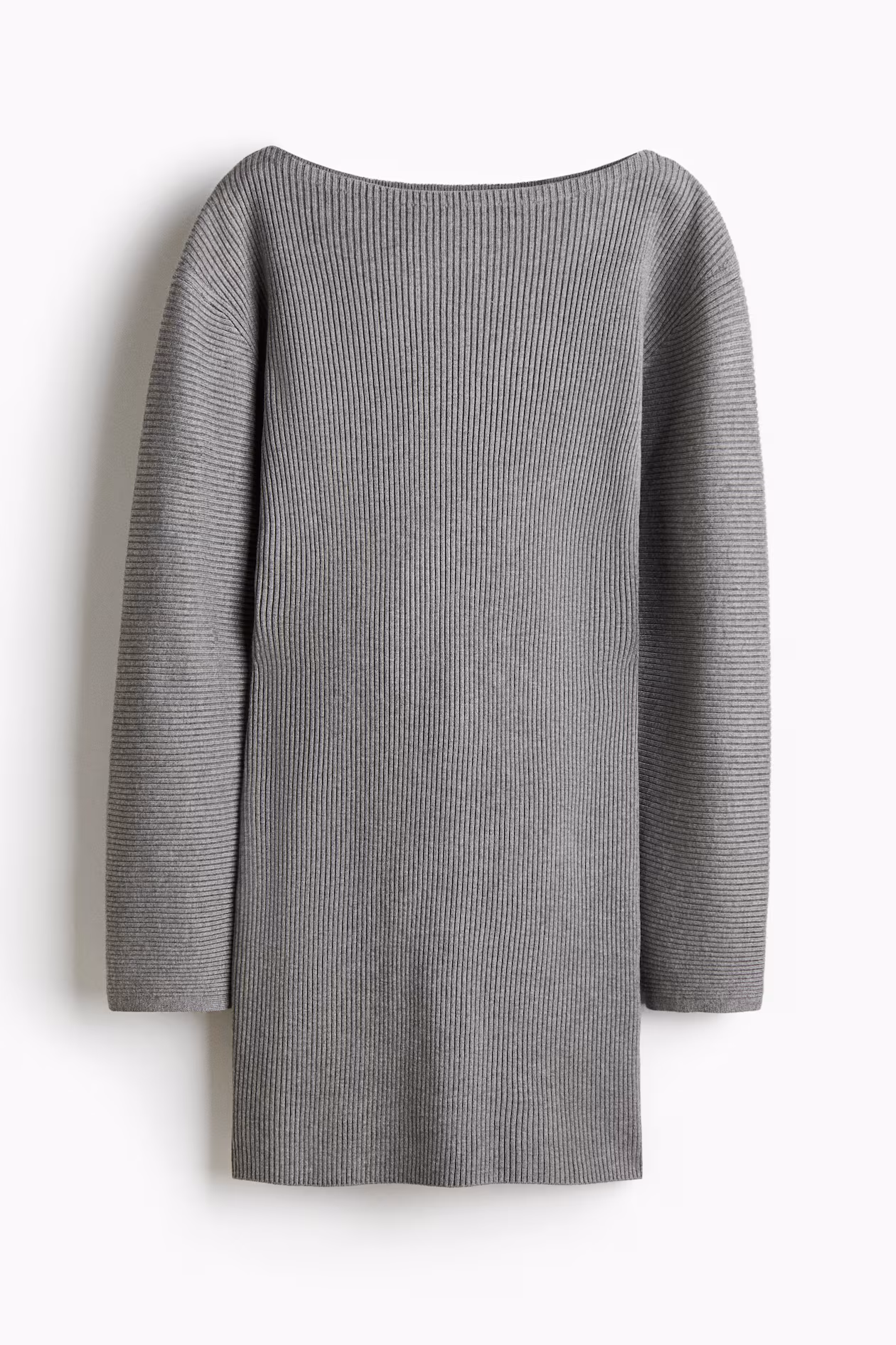 Short, fitted dress in a soft rib knit. Boat neck, heavily dropped shoulders, and long sleeves.