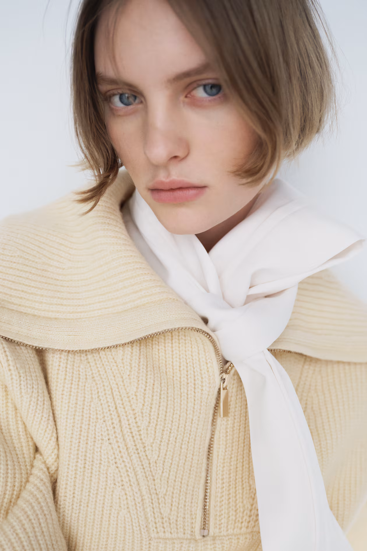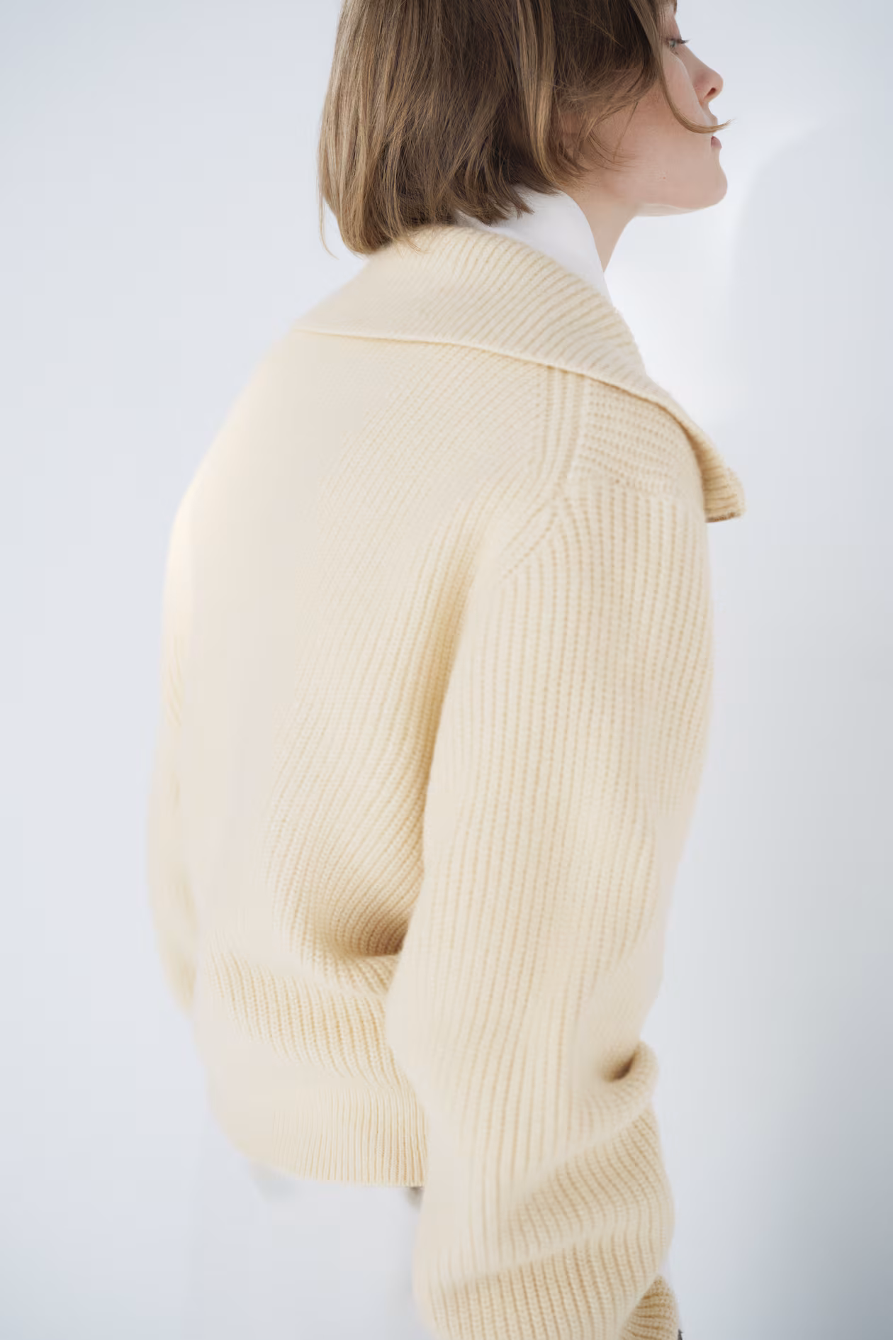 Soft knit sweater. High stand-up collar, half-zip, dropped shoulders, and long sleeves. Ribbing at cuffs and hem.