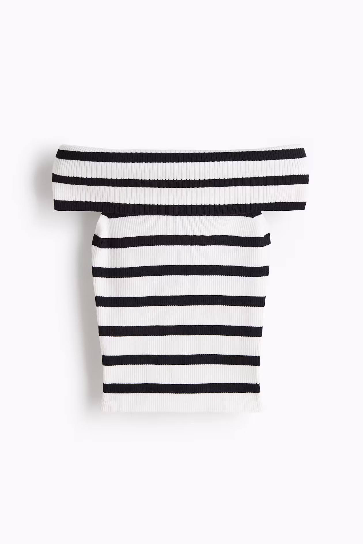 Short, fitted, off-the-shoulder top in a soft rib knit. Wide, foldover upper edge.