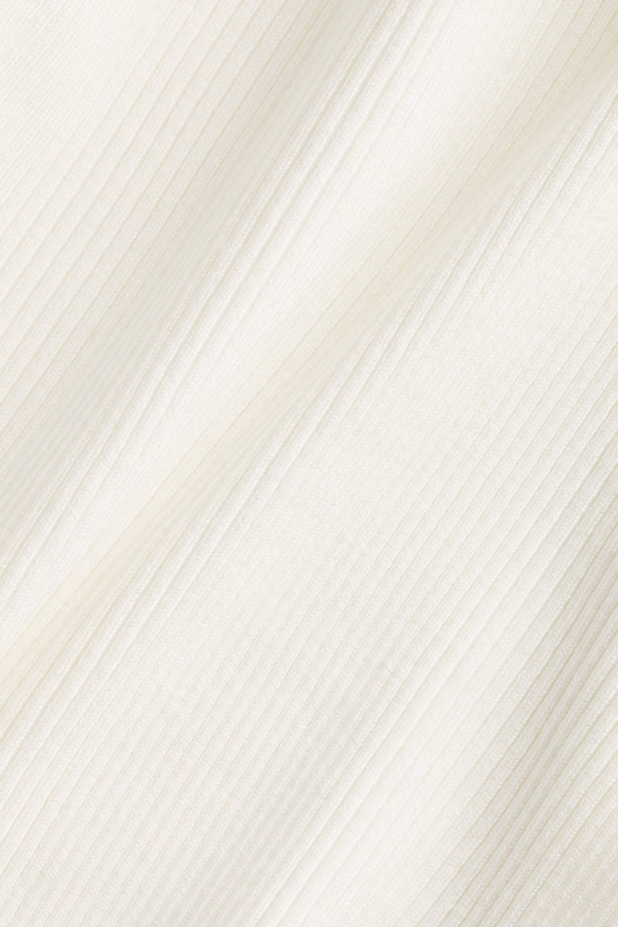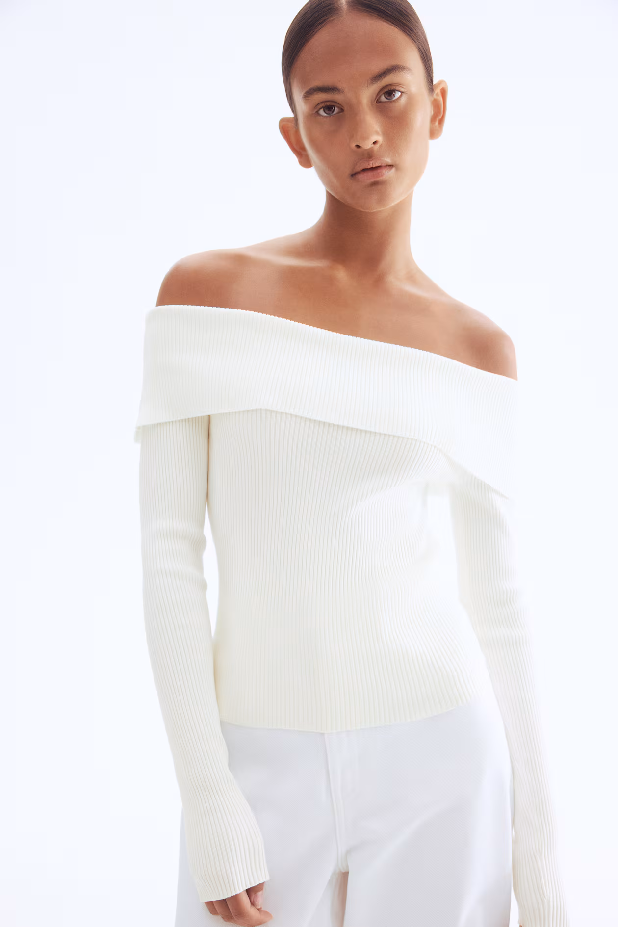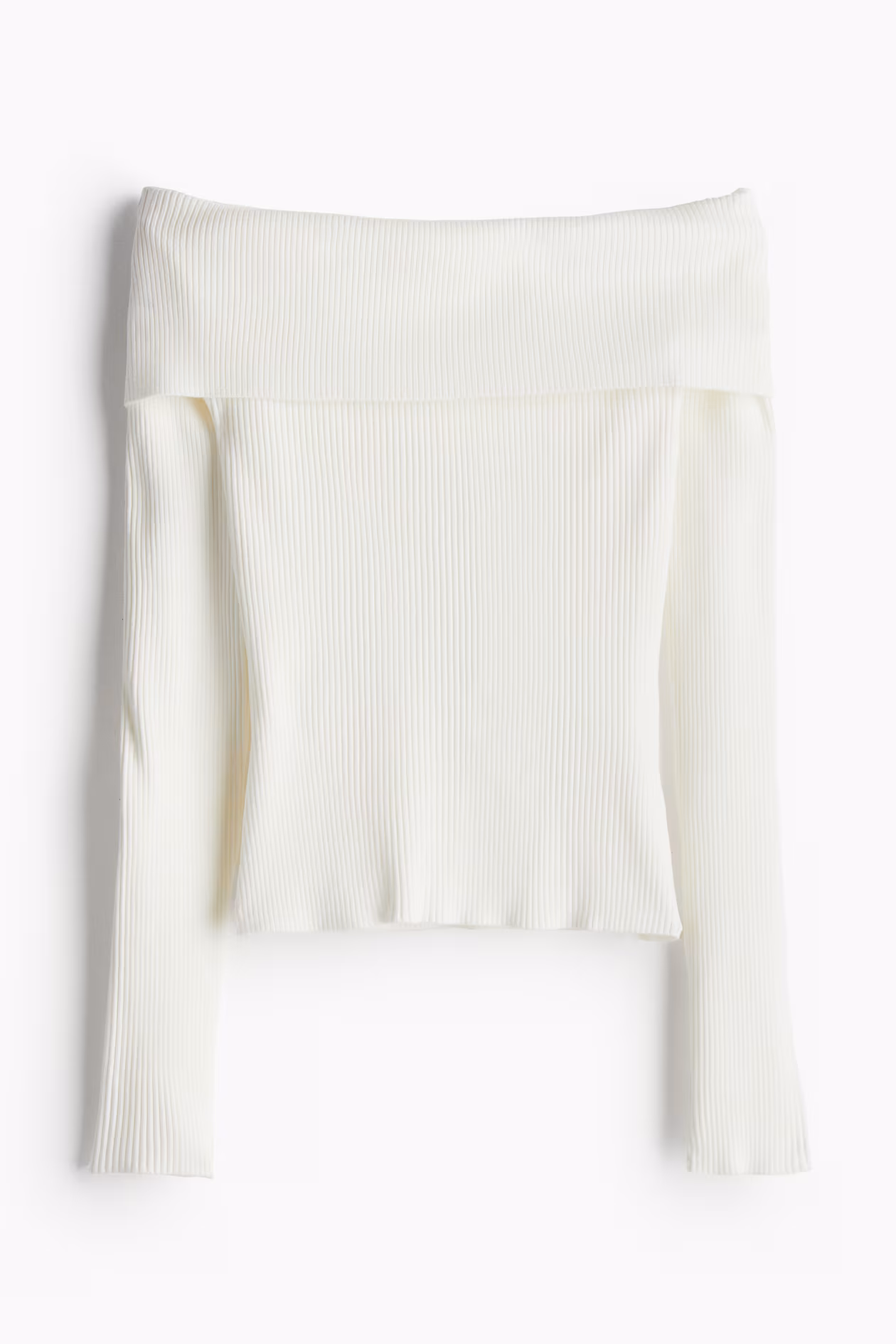 Short, fitted, off-the-shoulder top in a soft rib knit. Wide foldover upper edge and long sleeves.