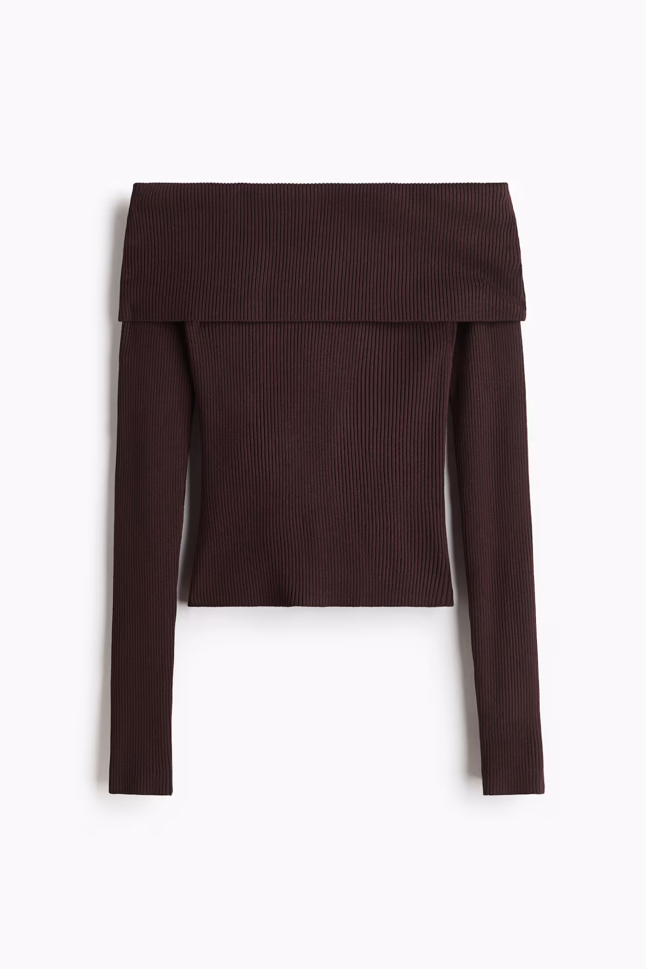 Short, fitted, off-the-shoulder top in a soft rib knit. Wide foldover upper edge and long sleeves.