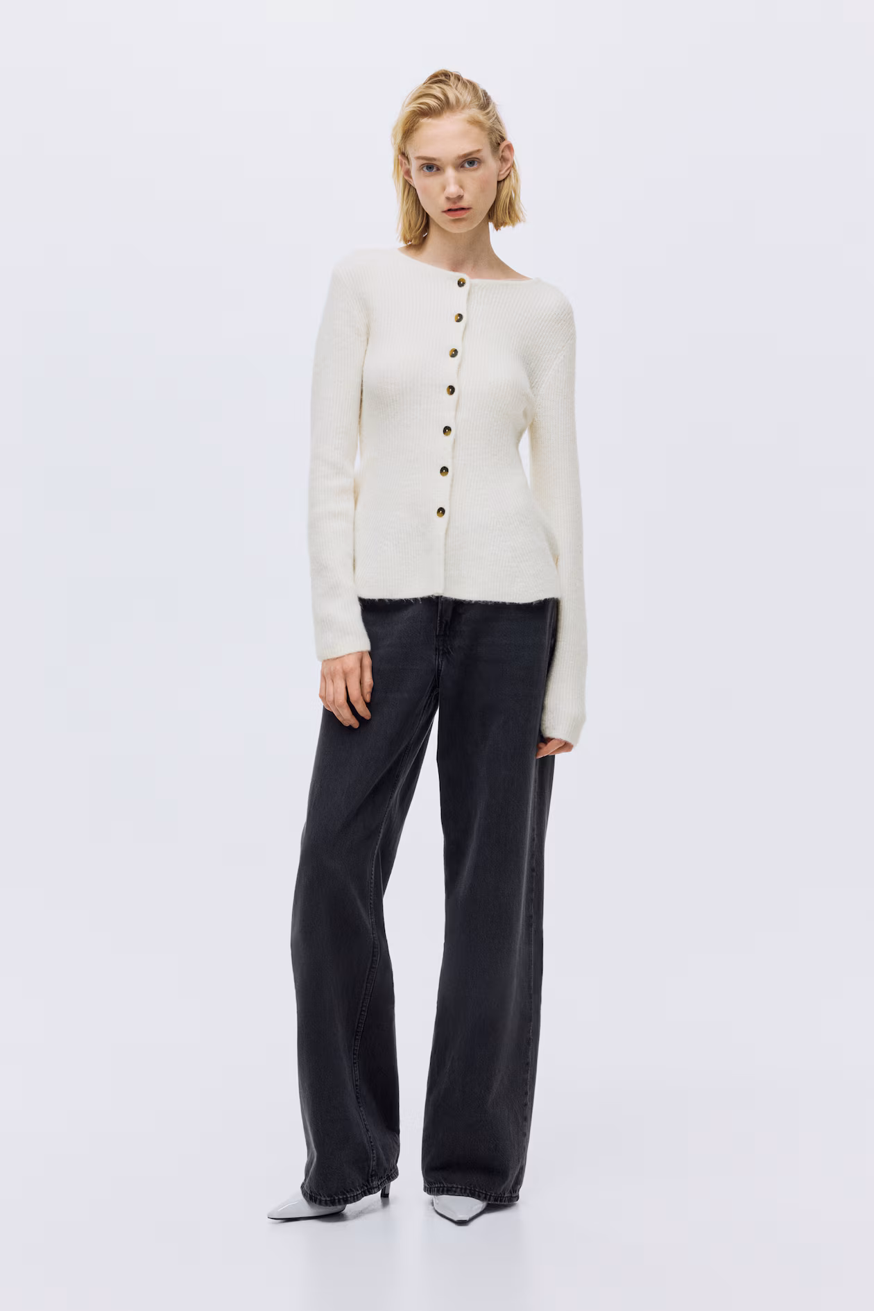 Soft, rib-knit cardigan. Round neckline, buttons at front, and long sleeves. Flared peplum.