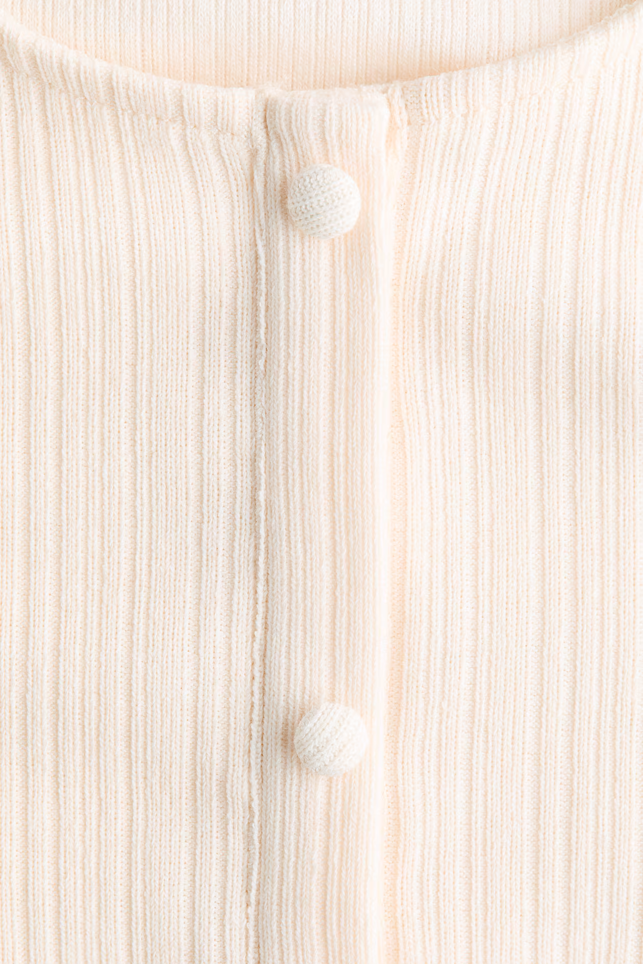 Fitted cardigan in a fine rib knit. Round neckline, covered buttons from neckline to waist, and gathered seam above a peplum. Long sleeves with ruffle-trimmed cuffs.